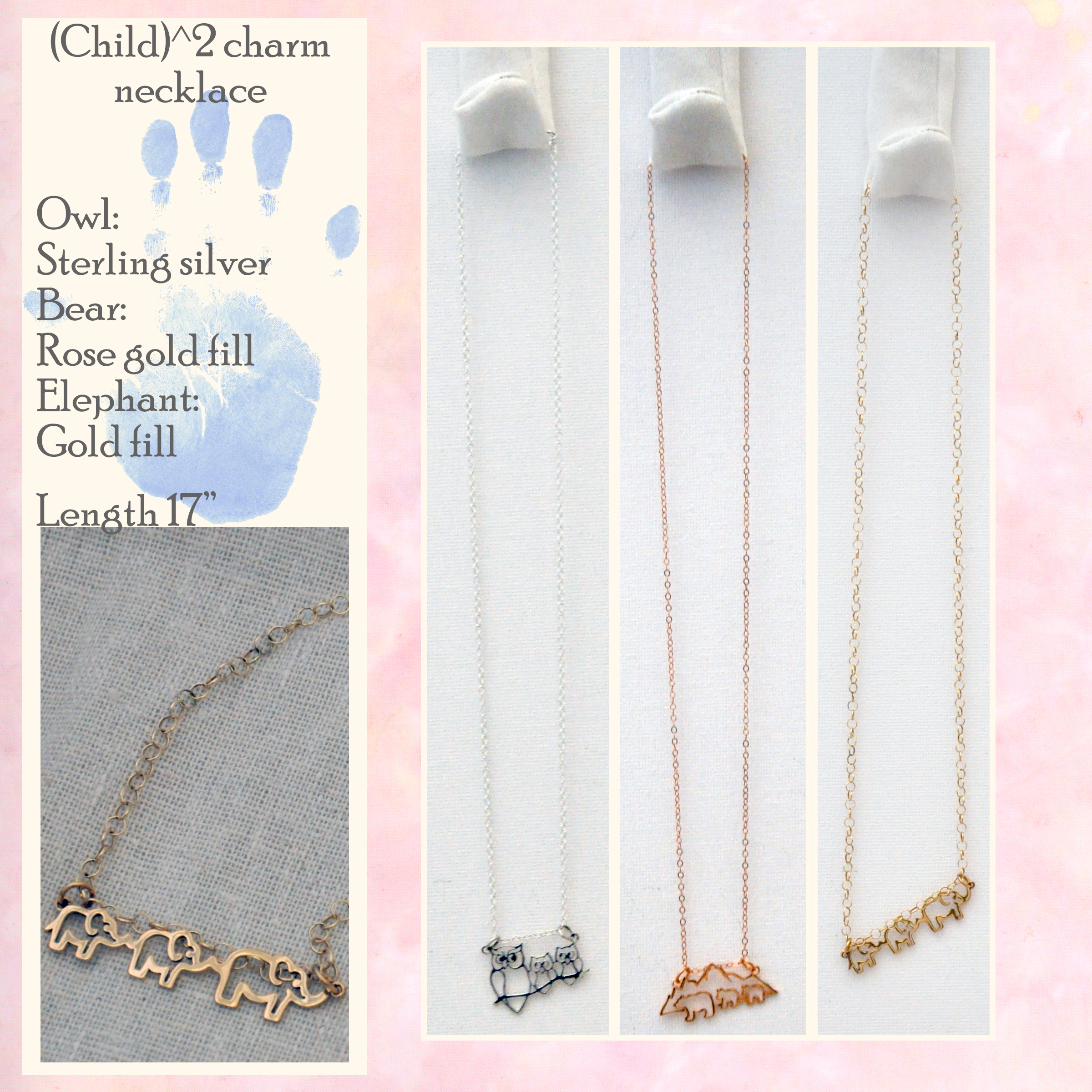feature a favorite animal parent with two offspring. The rose gold fill necklace features a