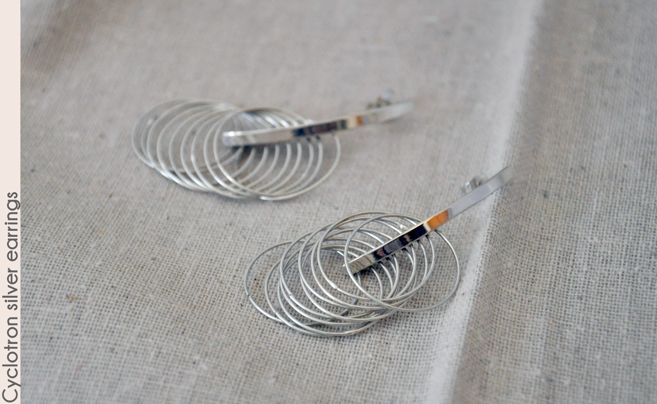 They feature sterling silver rings cascading down a curved bar, like following the circular paths of the particles.