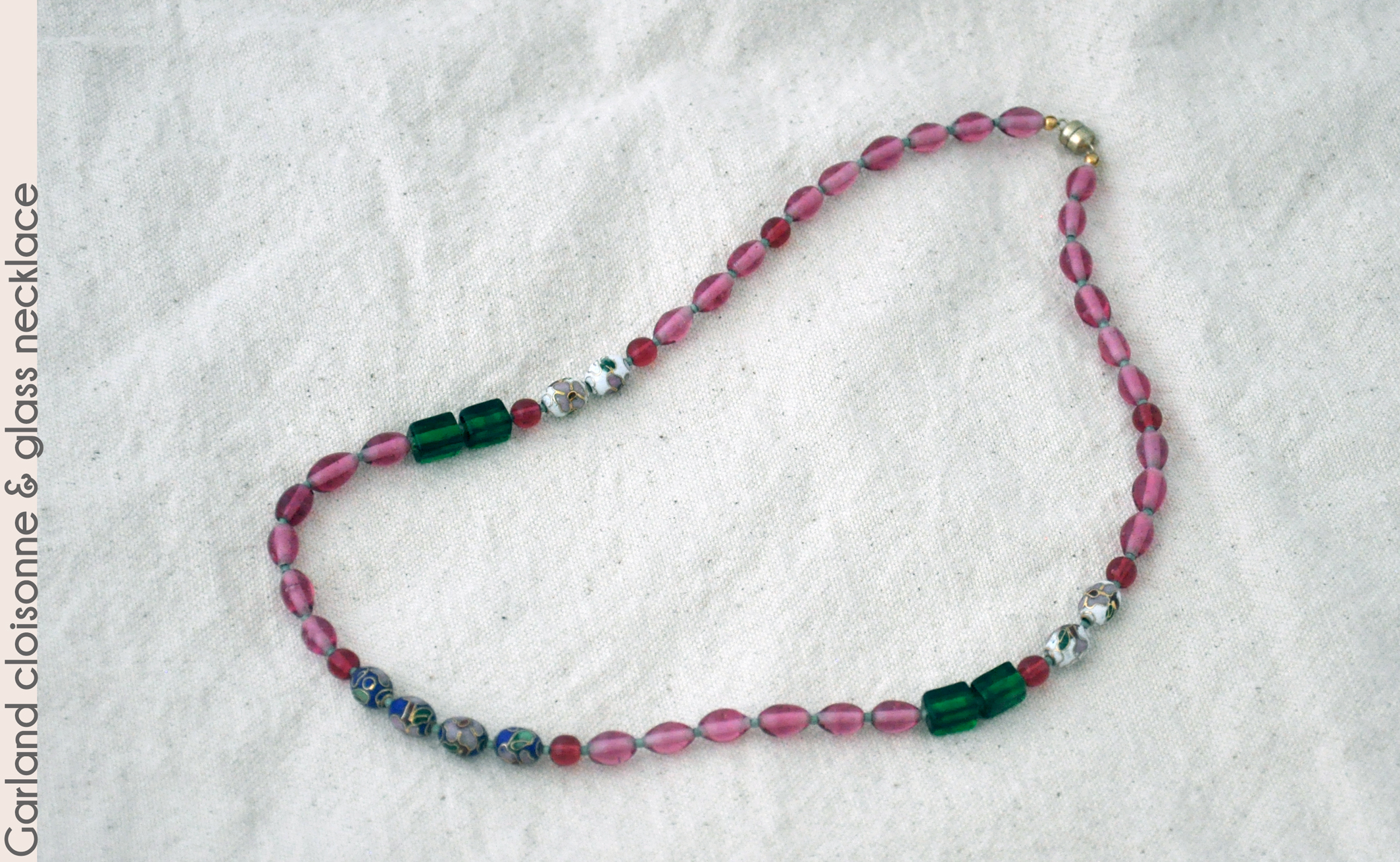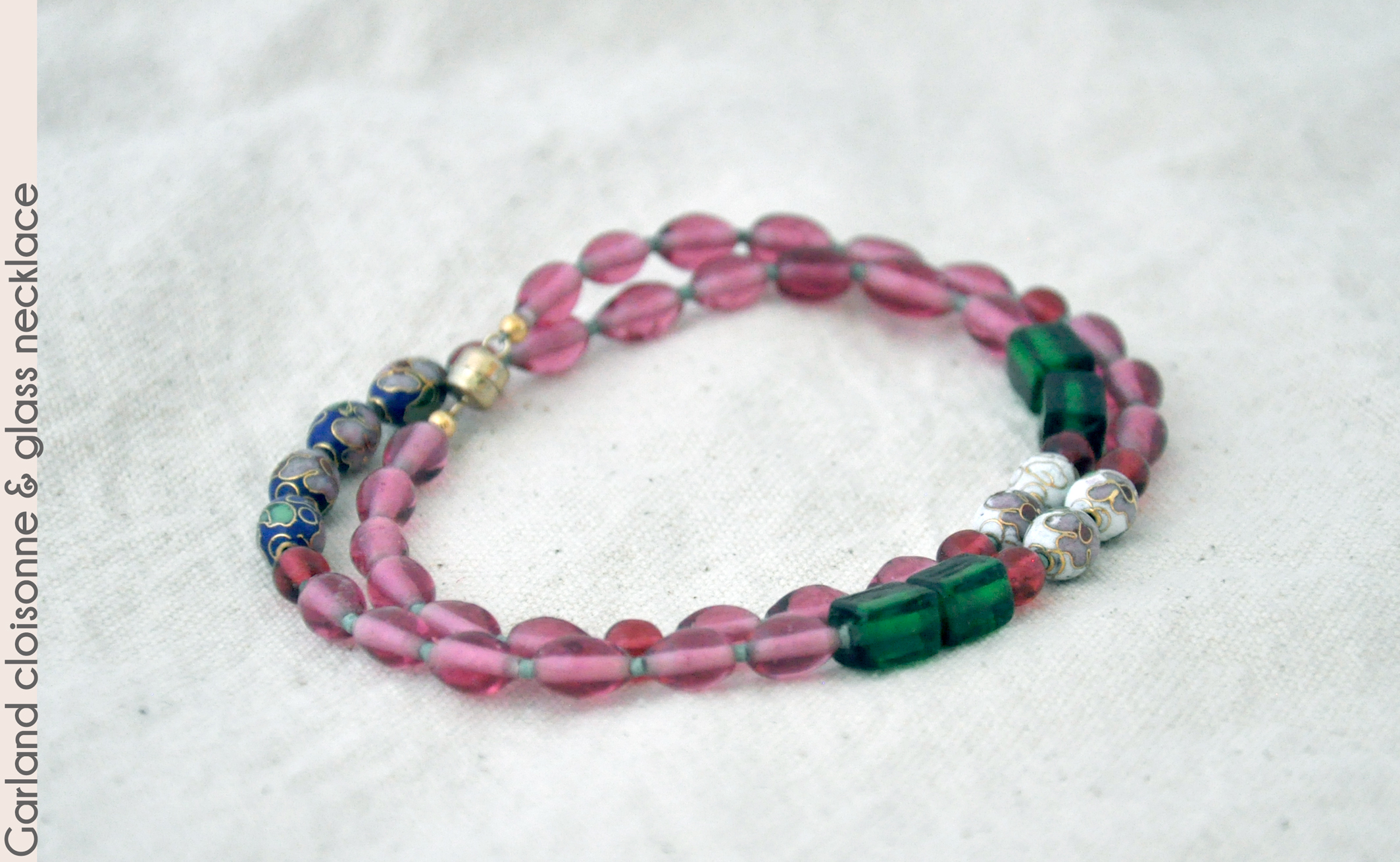 metal ornaments. The necklace has cranberry glass ovals and deep green Czech pressed glass along with cloisonne