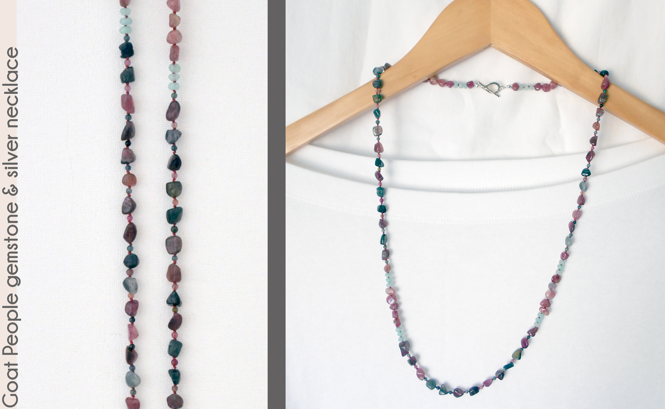 nuggets are handknotted on natural silk cord and spaced with pale blue amazonite rondelles. Sterling silver toggle clasp.