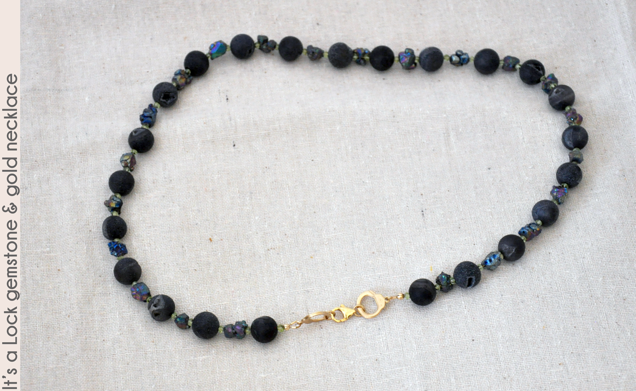 Dark druzy agate and coated pyrite gemstones spaced with glass seedbeads are the base of this 21" necklace,