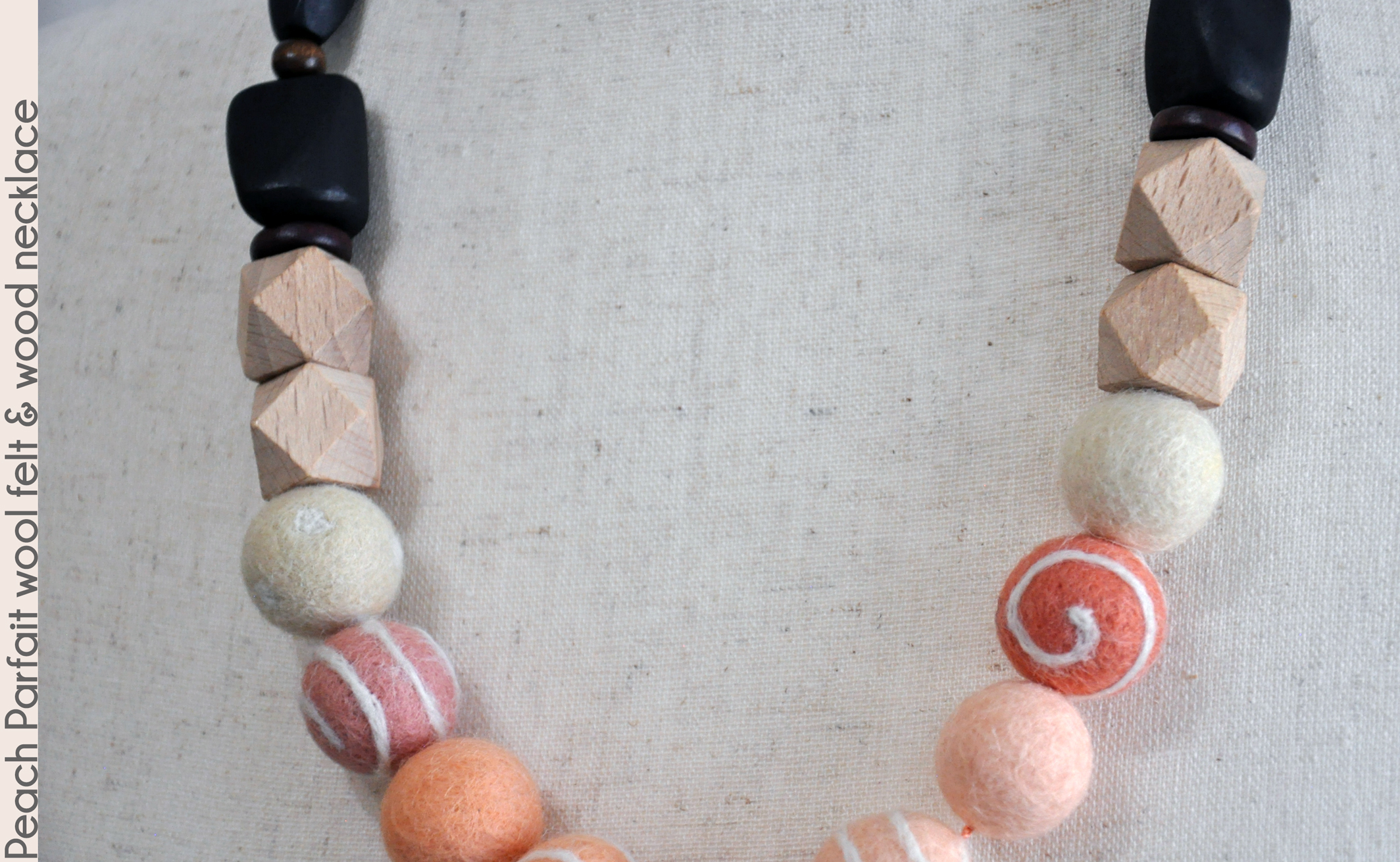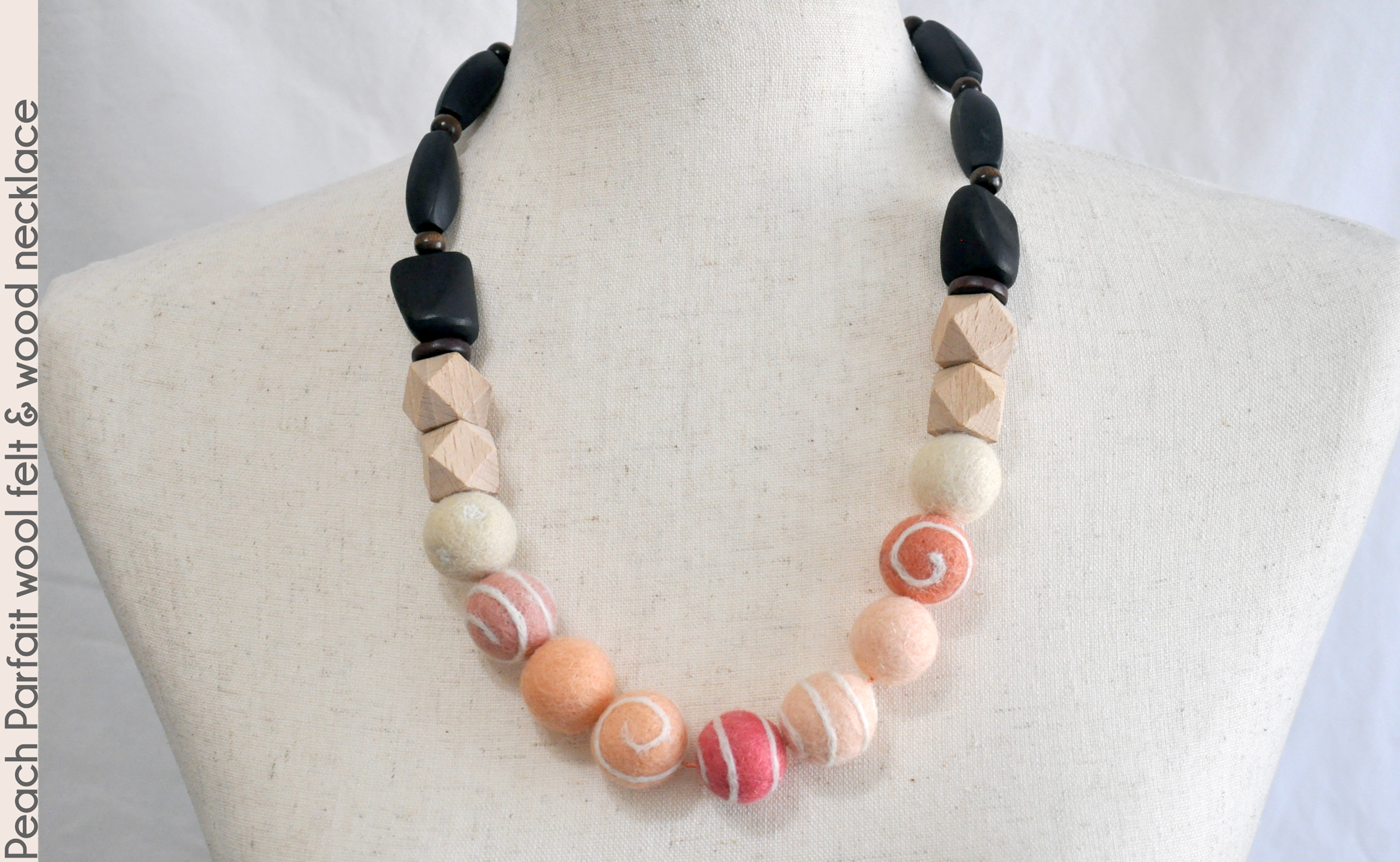 Yummy peach parfait colors are found in this fun 24" wool felt and wood necklace. The wool felt beads