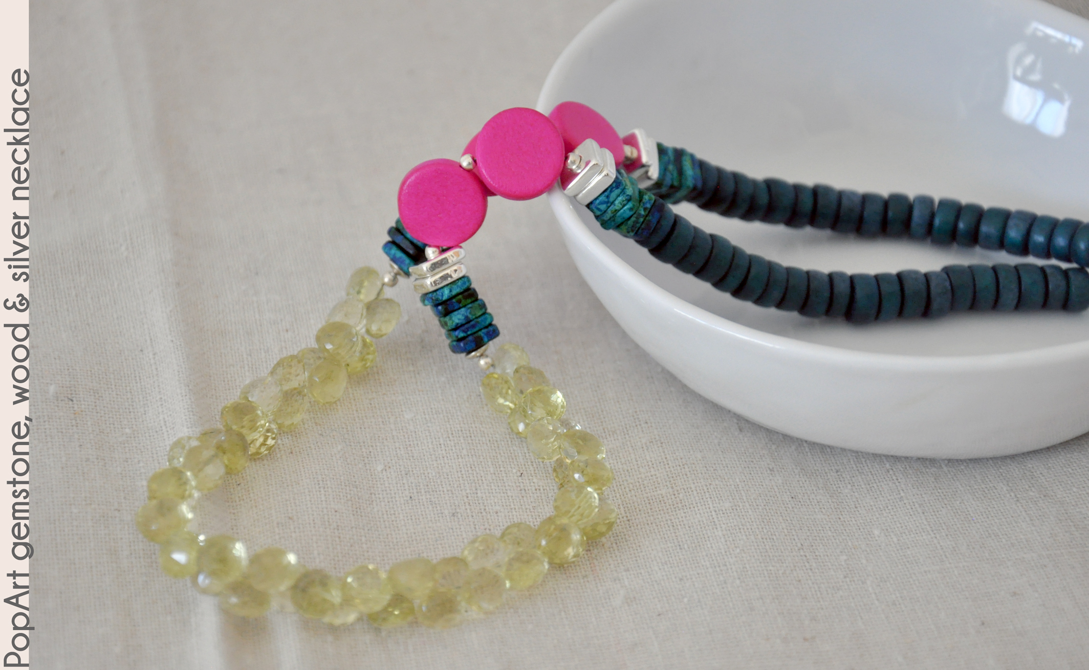 and hot pink wood coins to the sides. Teal blue wood rondelles finish the piece and attach to a Hill Tribe silver toggle
