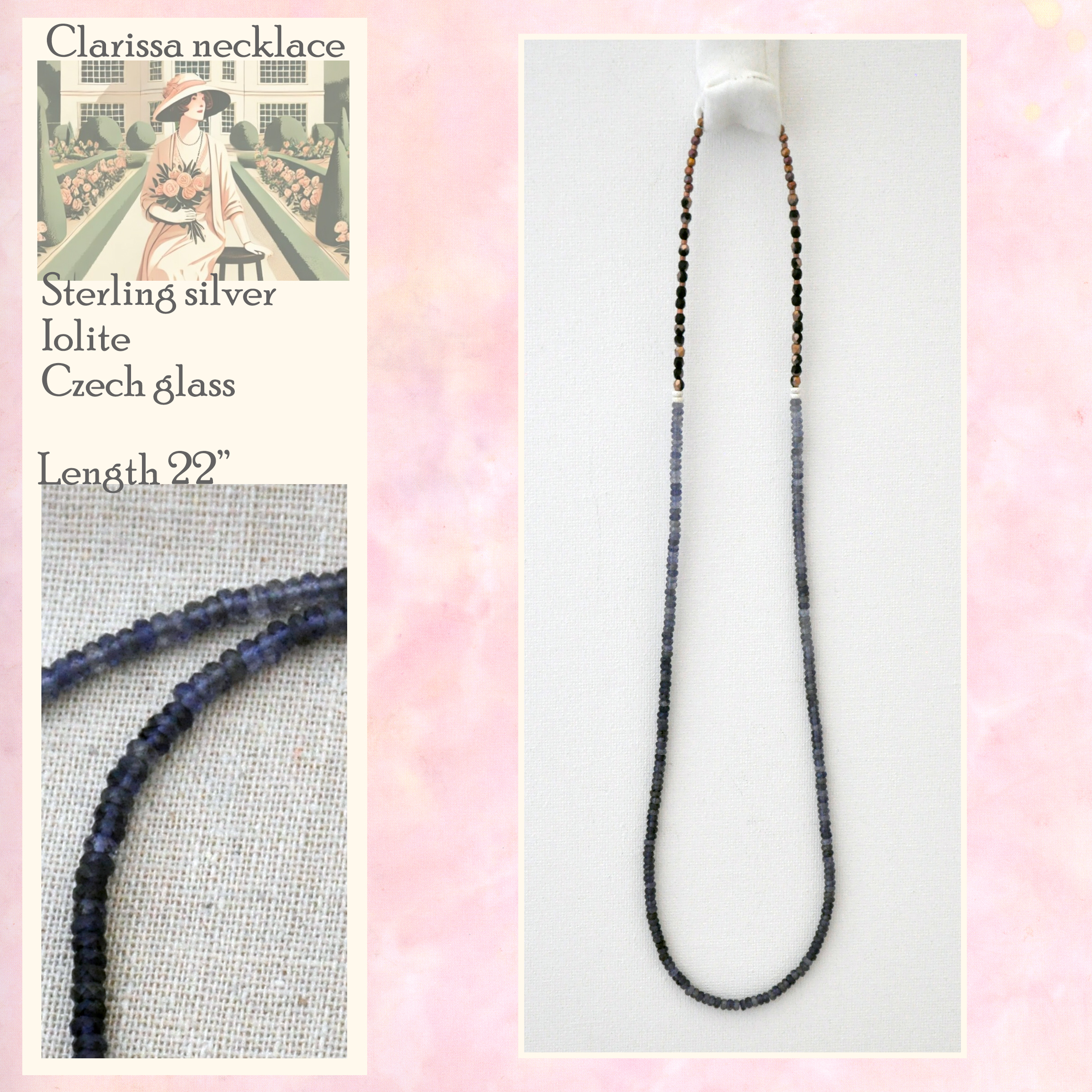 This 22" slim gemstone necklace is made of iolite rondelles and Czech fire polished glass, fastening with