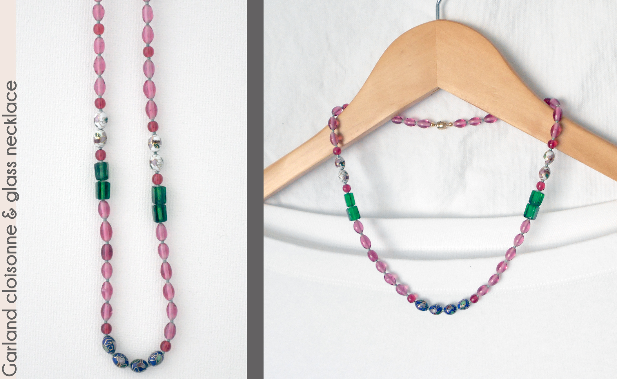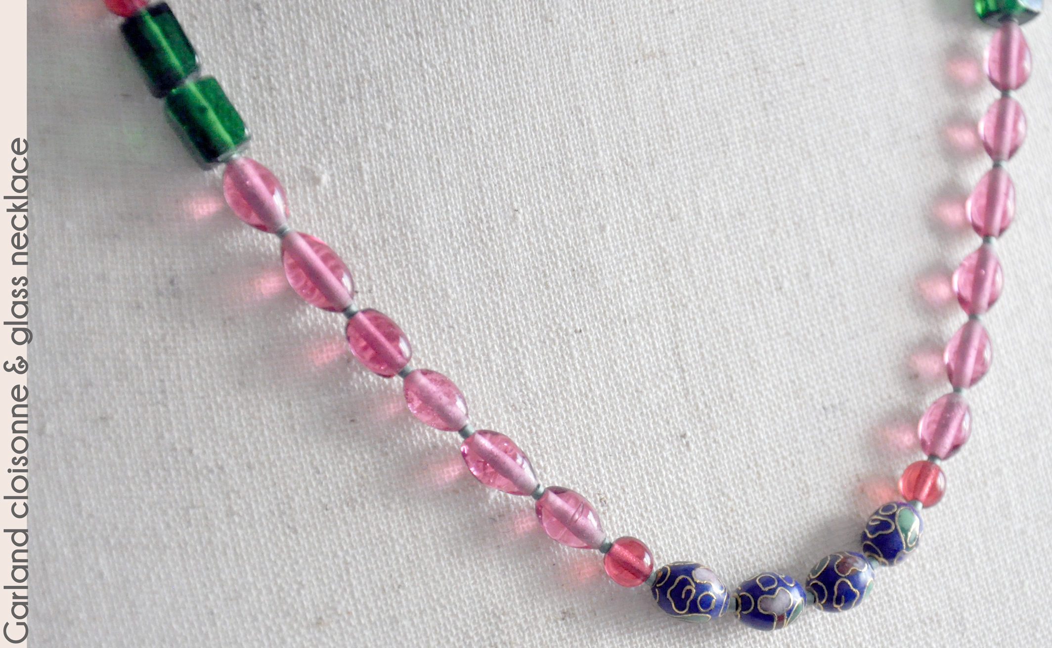 metal ornaments. The necklace has cranberry glass ovals and deep green Czech pressed glass along with cloisonne