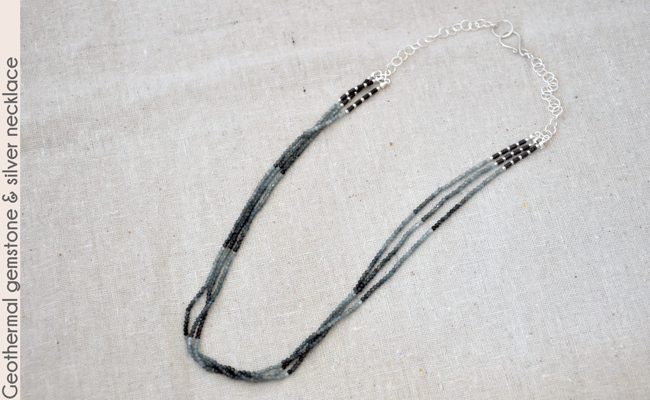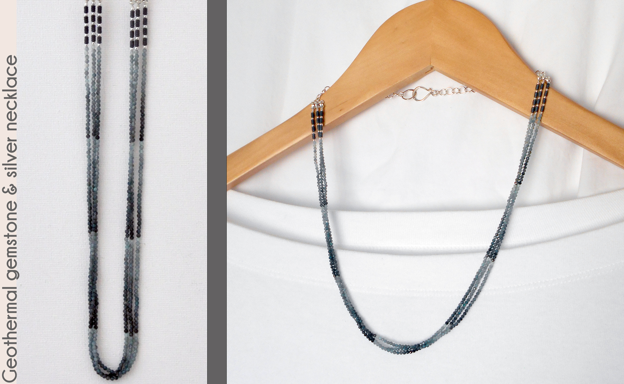 through liquids flowing and receding. Three slim strands ending in hematite gemstone attach to