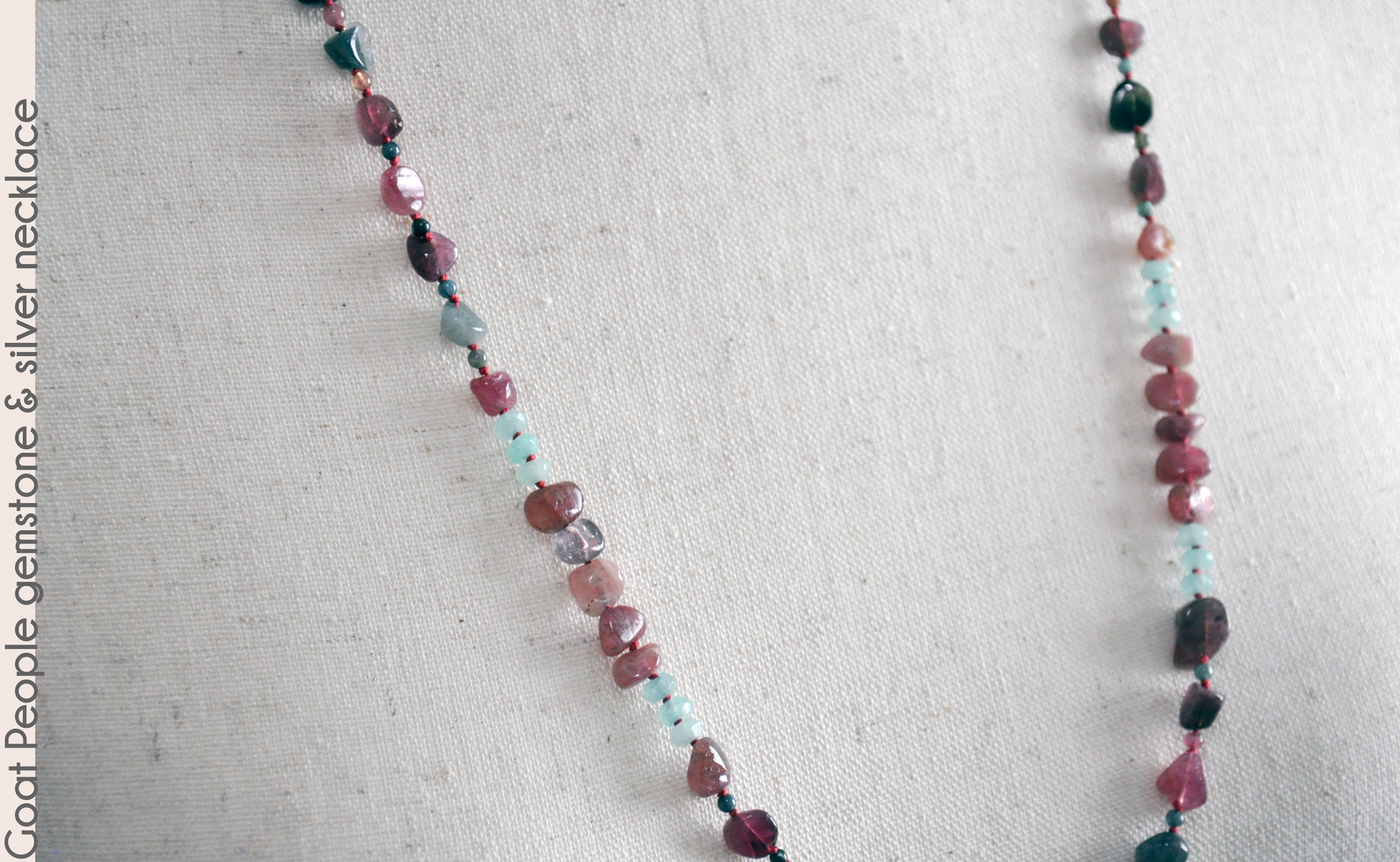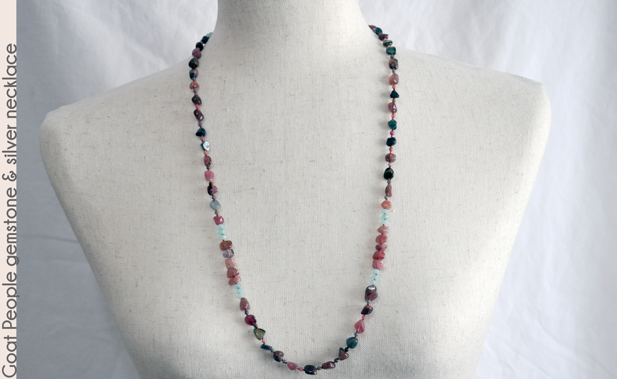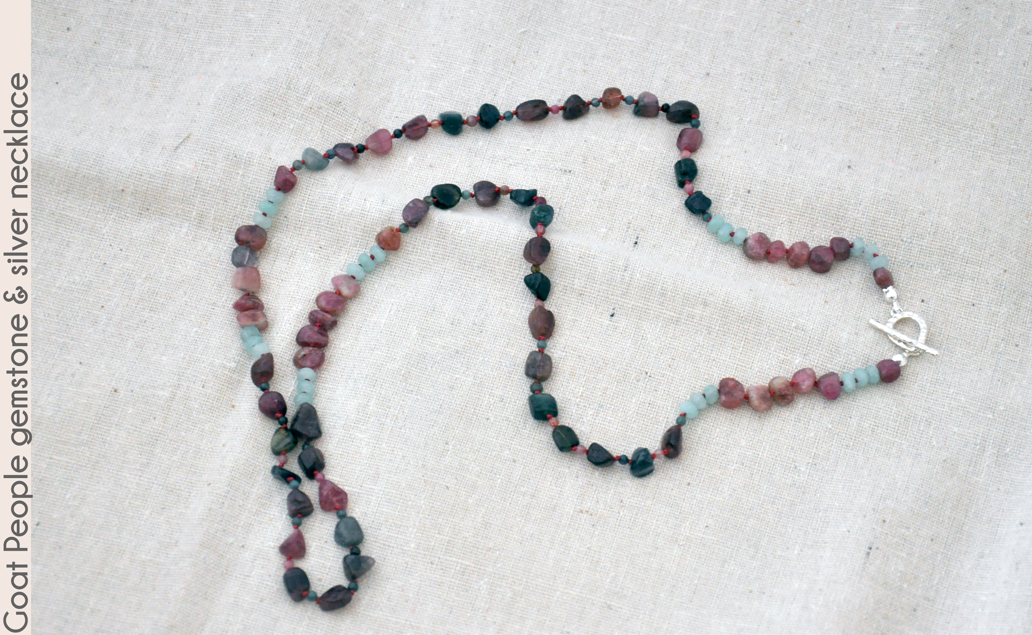 nuggets are handknotted on natural silk cord and spaced with pale blue amazonite rondelles. Sterling silver toggle clasp.