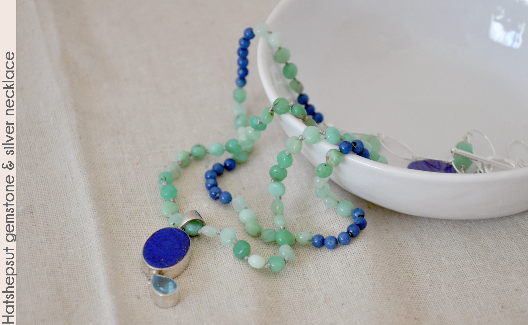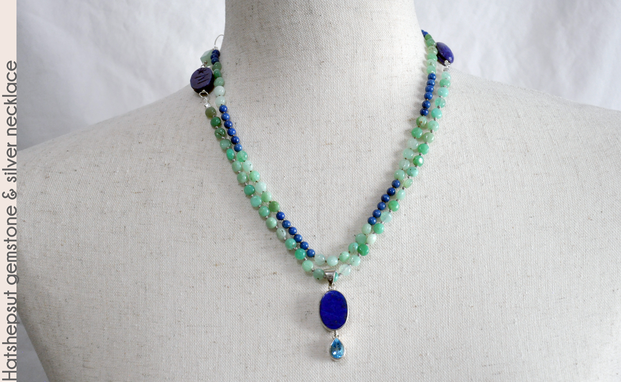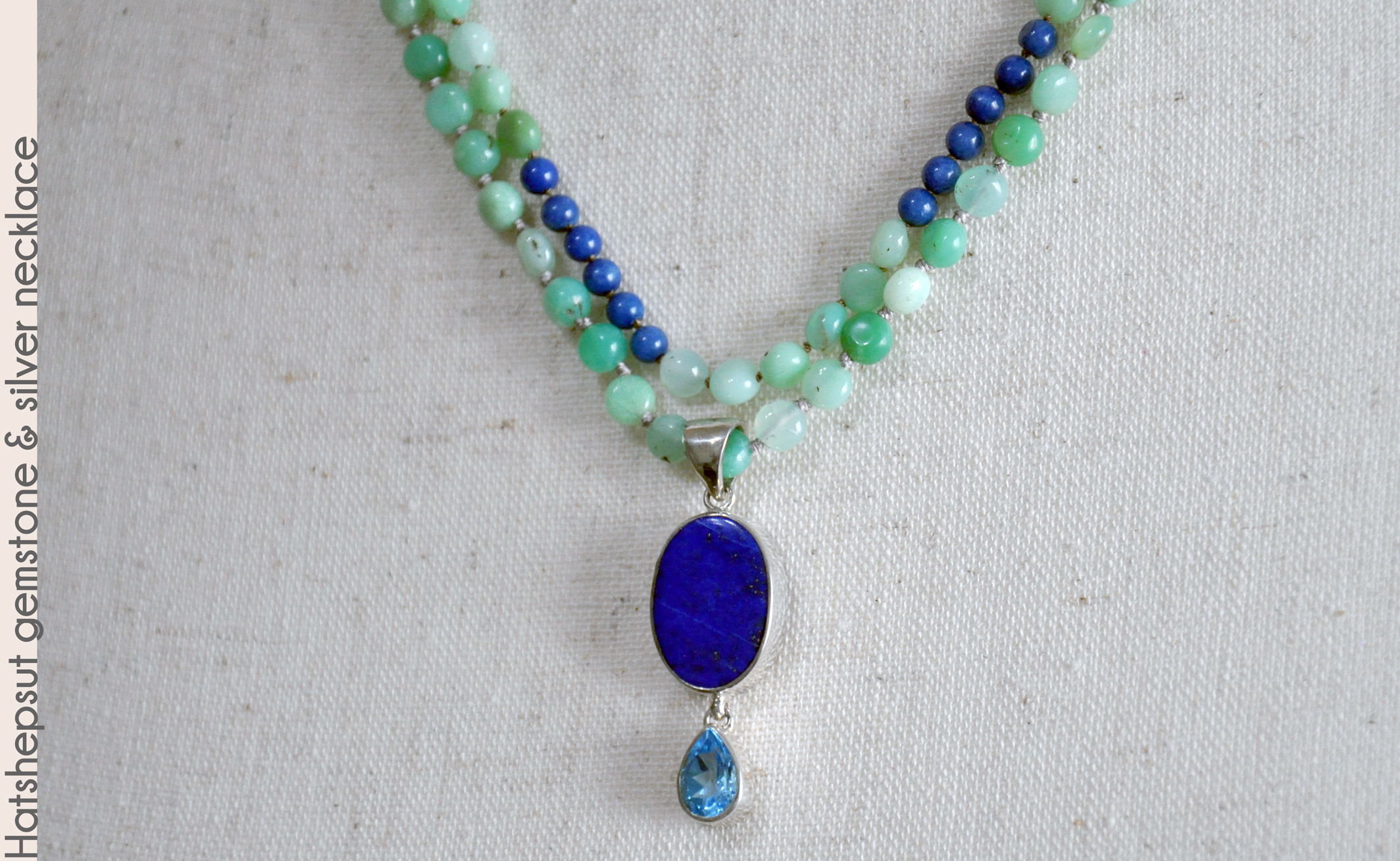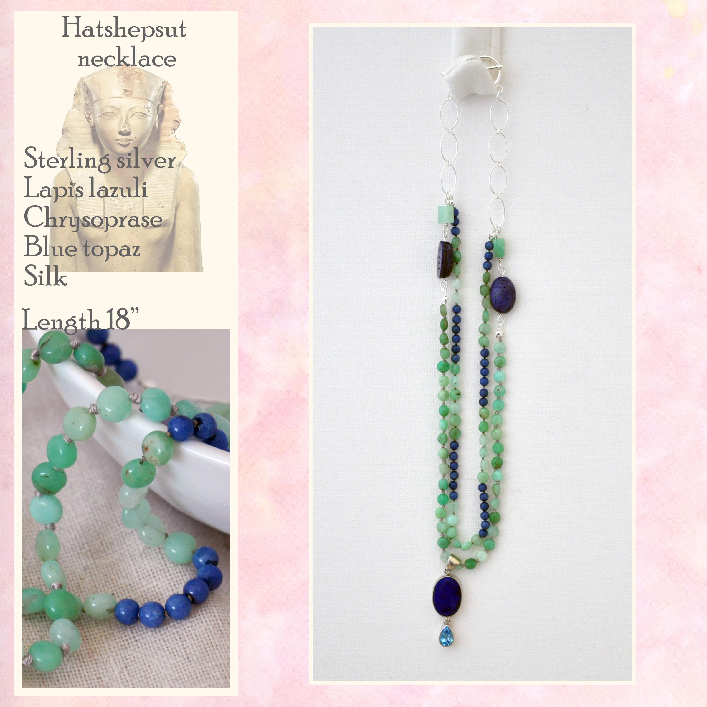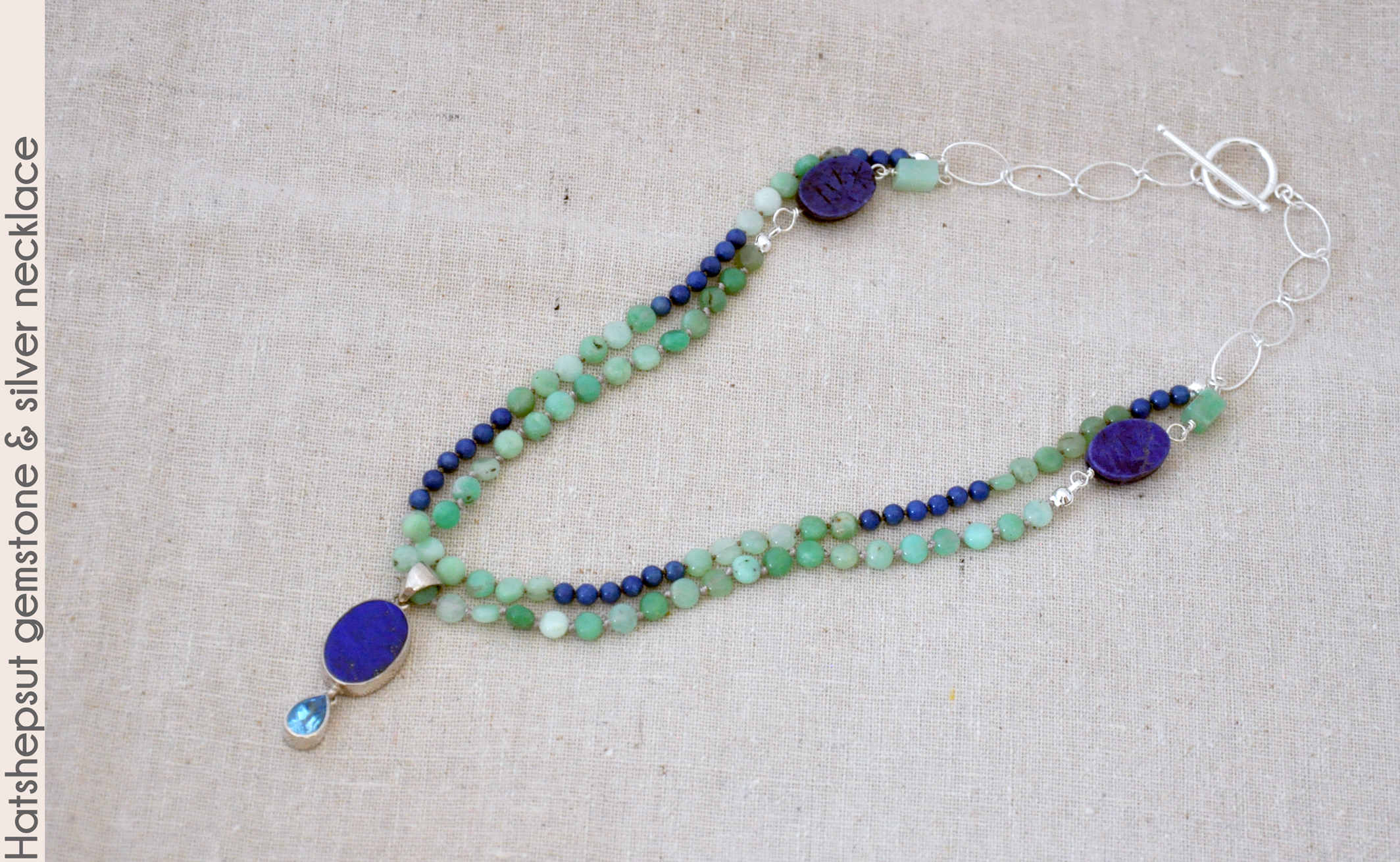 Egyptians. The central sterling silver pendant has an inset lapis lazuli gemstone and faceted blue topaz gemstone, and
