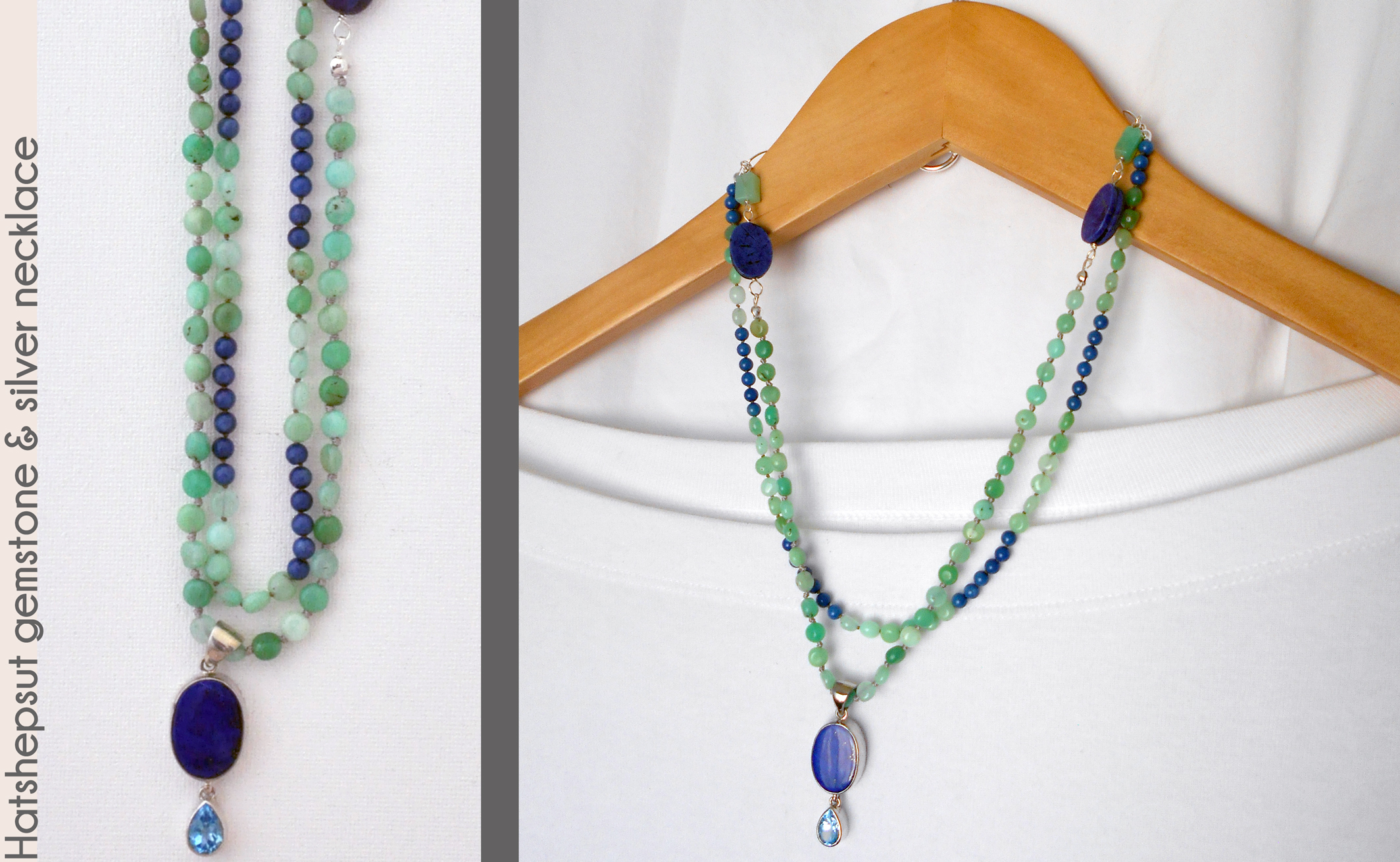 This 18" double strand necklace features the gemstones chrysoprase and lapis lazuli, both favored by ancient