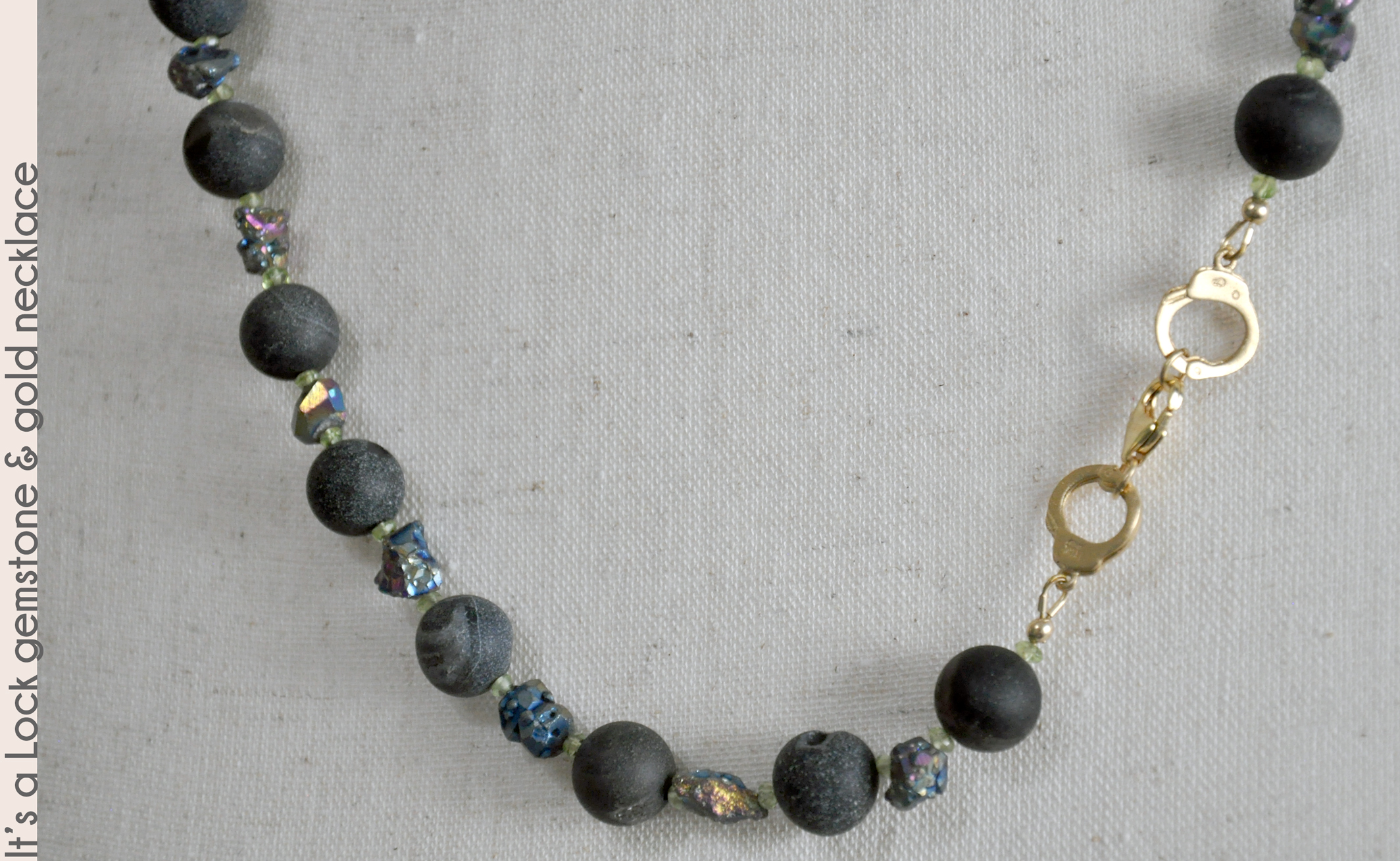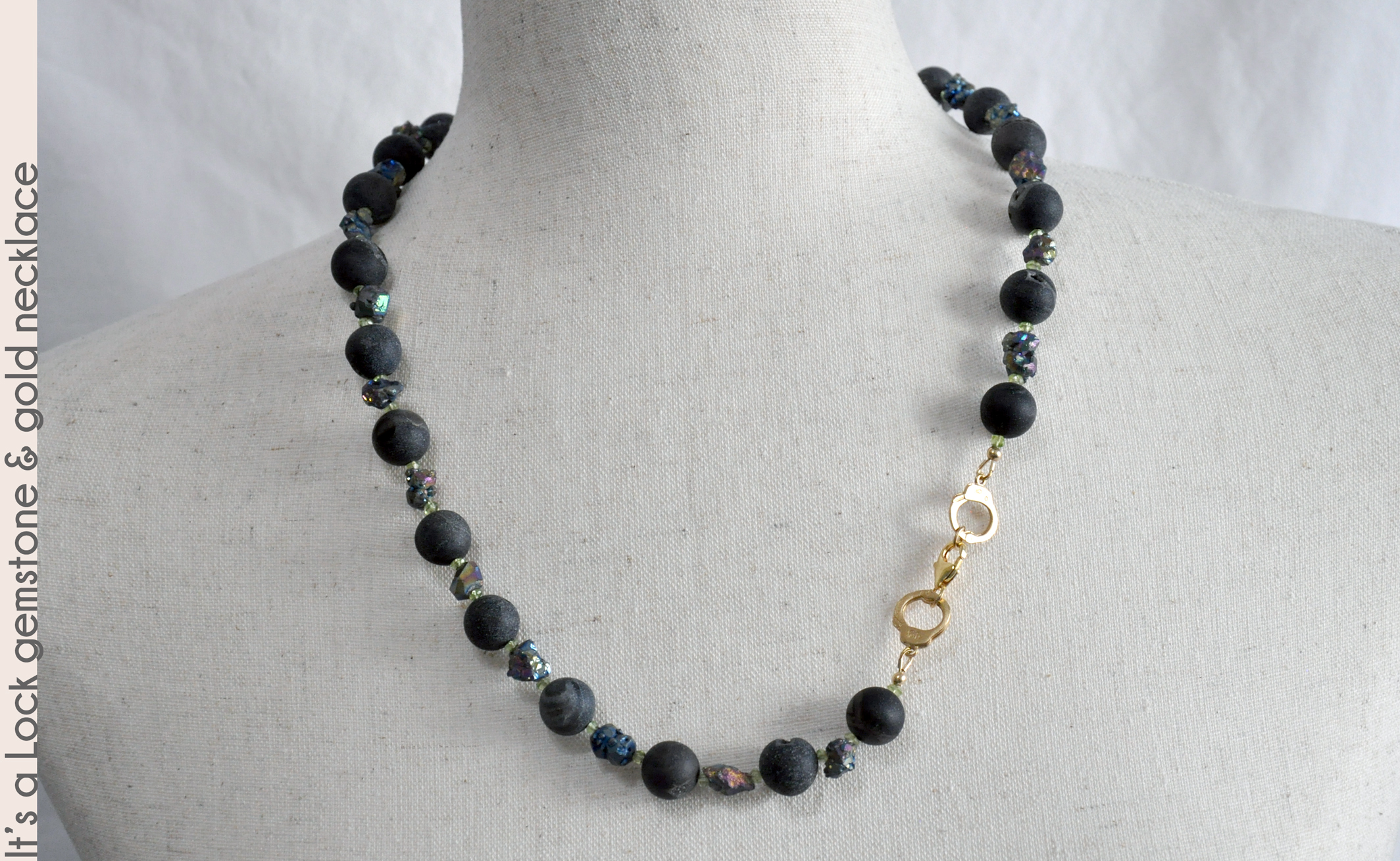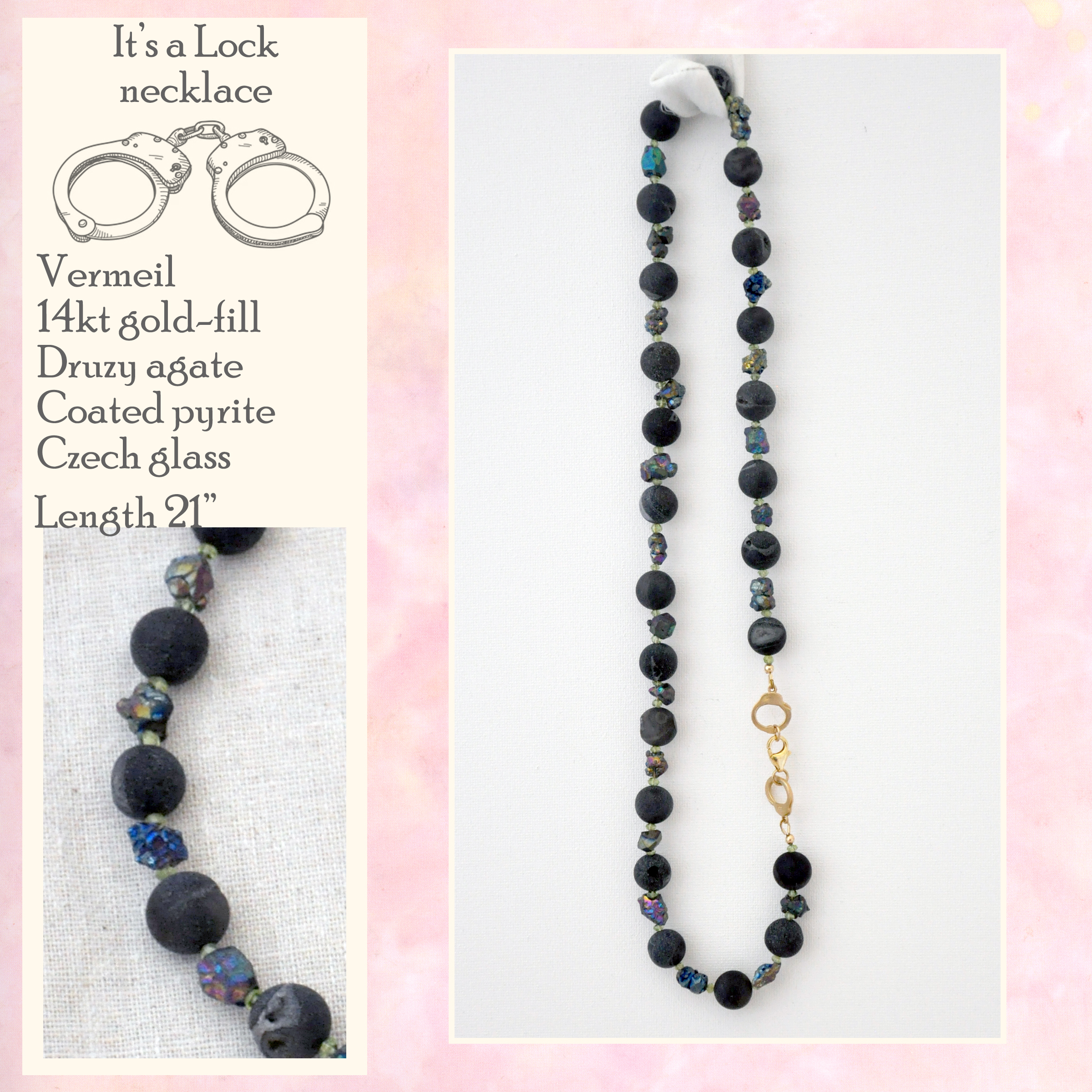 featuring a vermeil set of handcuffs and 14kt gold-fill lobster claw clasp. Druzy agate shows small crystals in