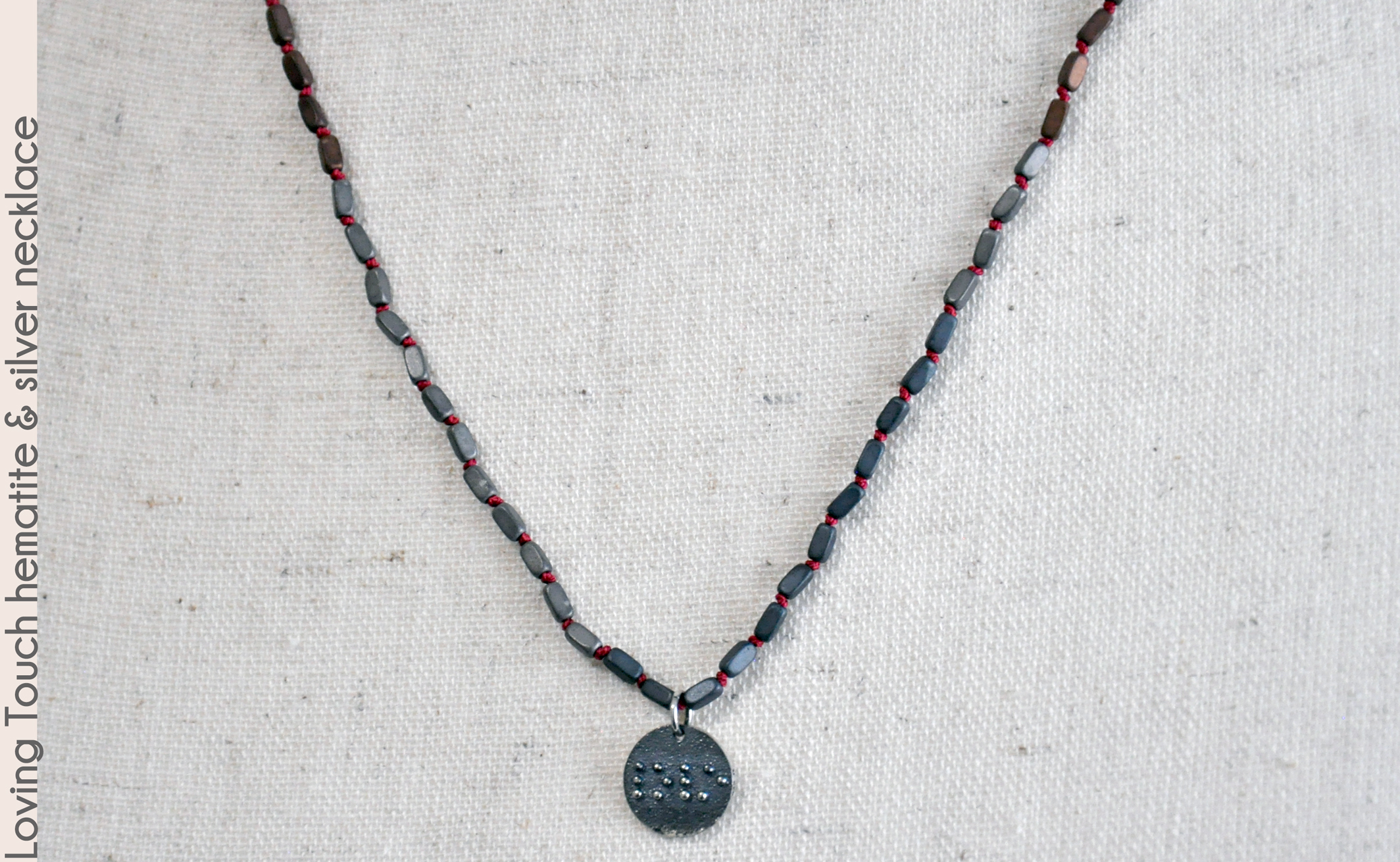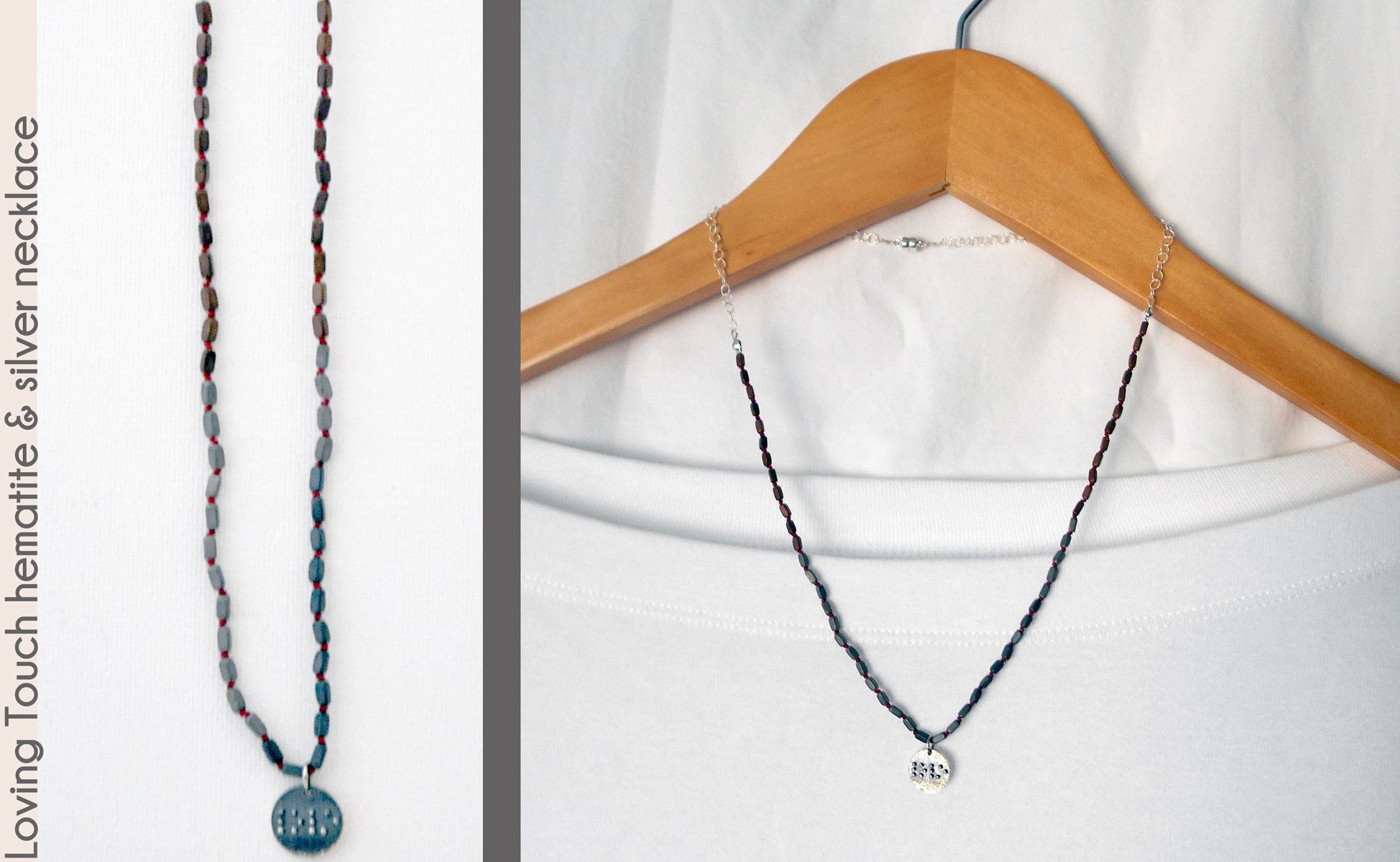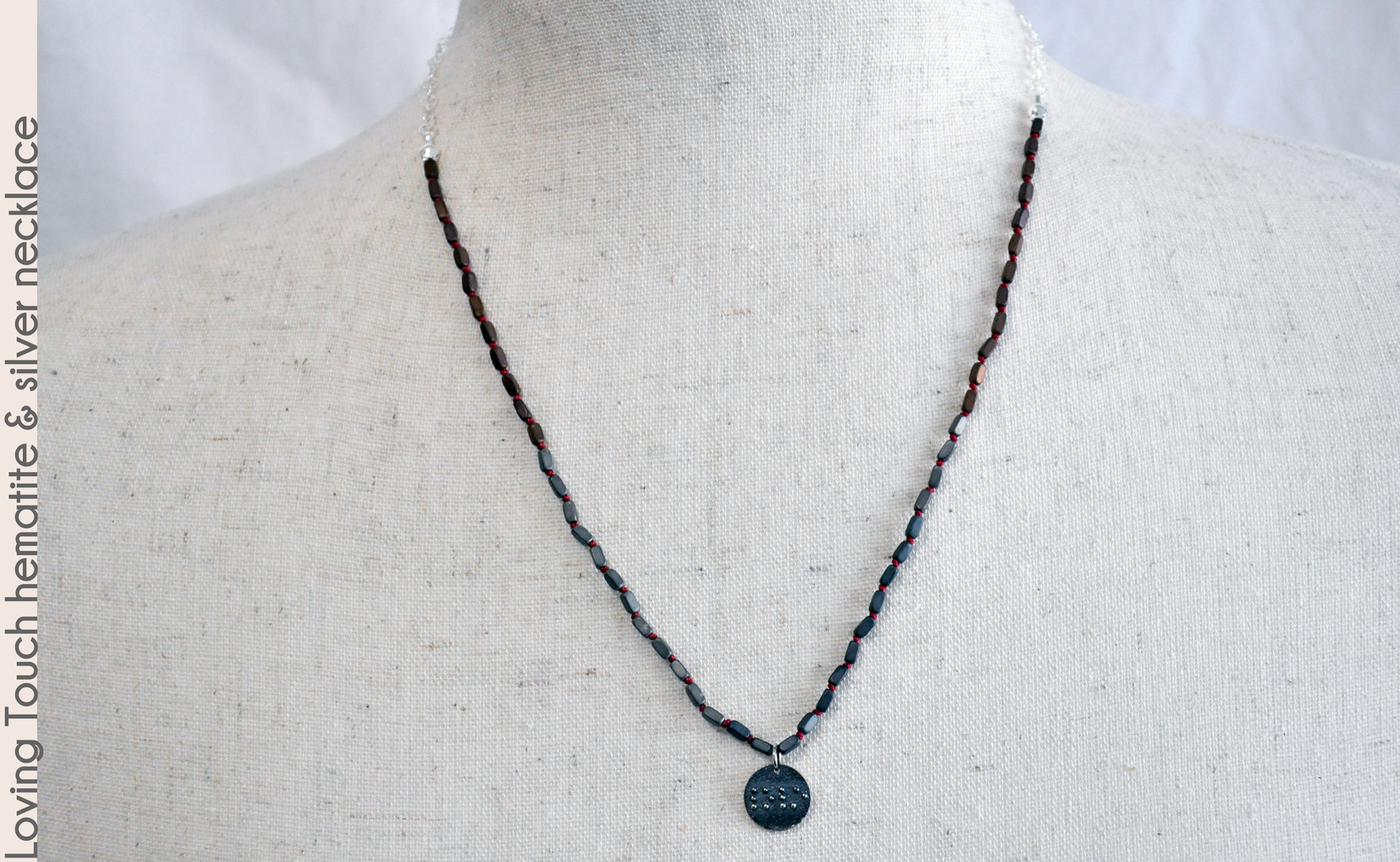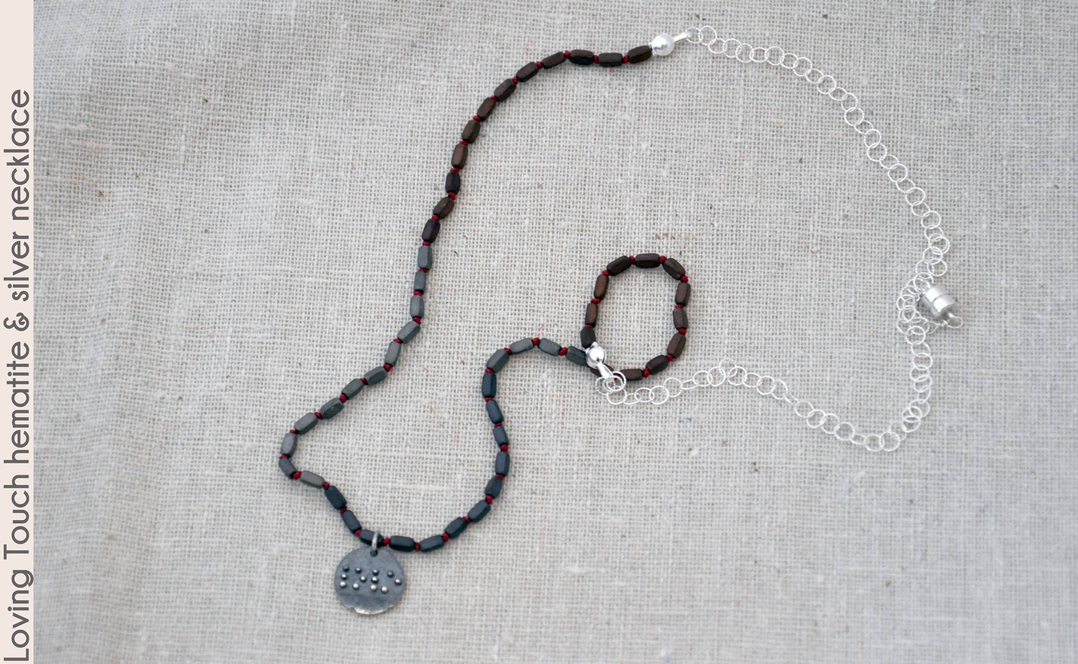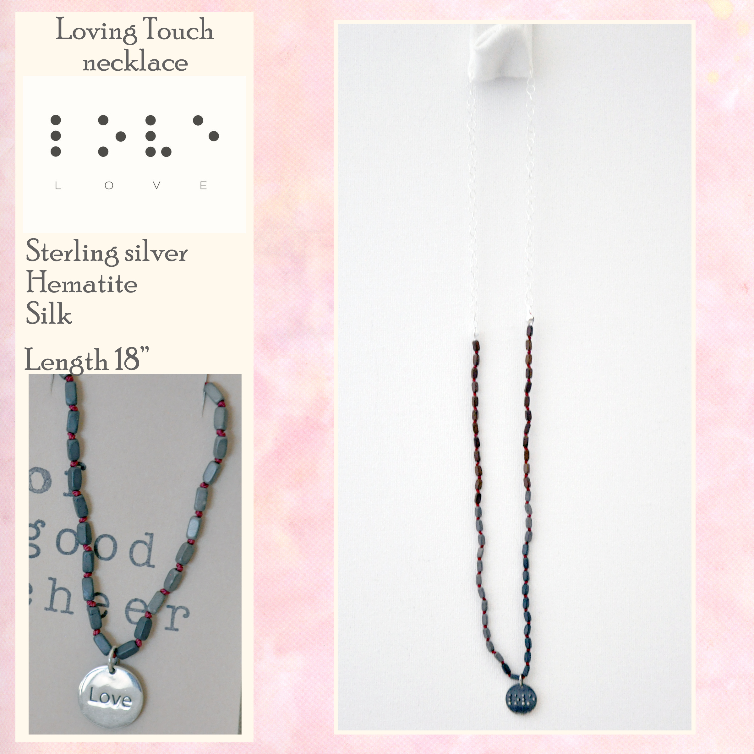 A tactile necklace with a loving touch. This 18" handknotted hematite necklace features a sterling silver pendant with "love" in Braille on one