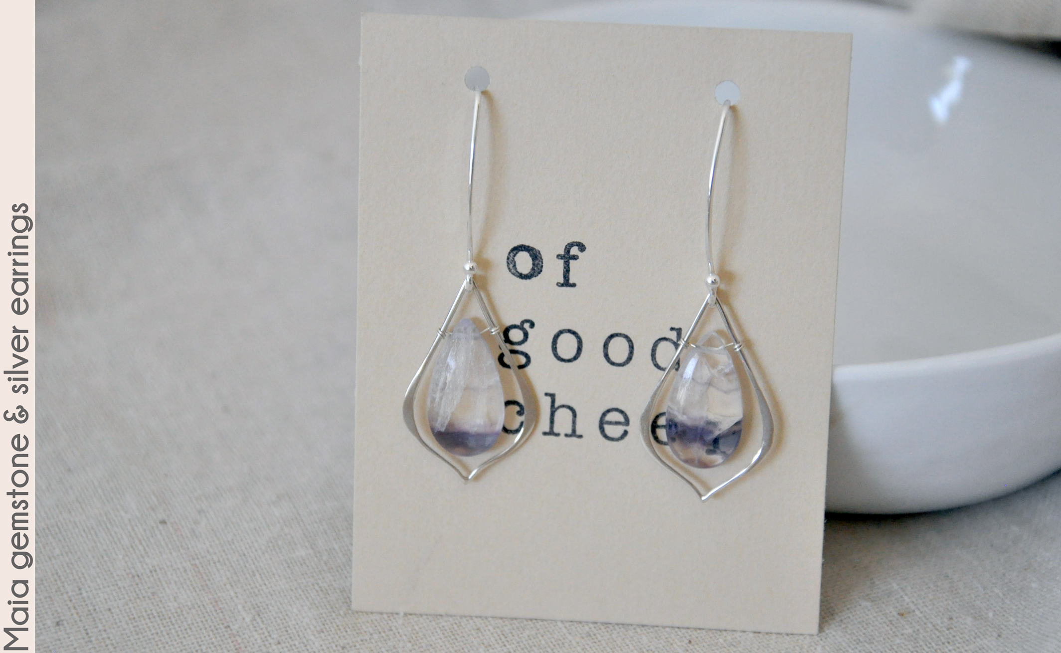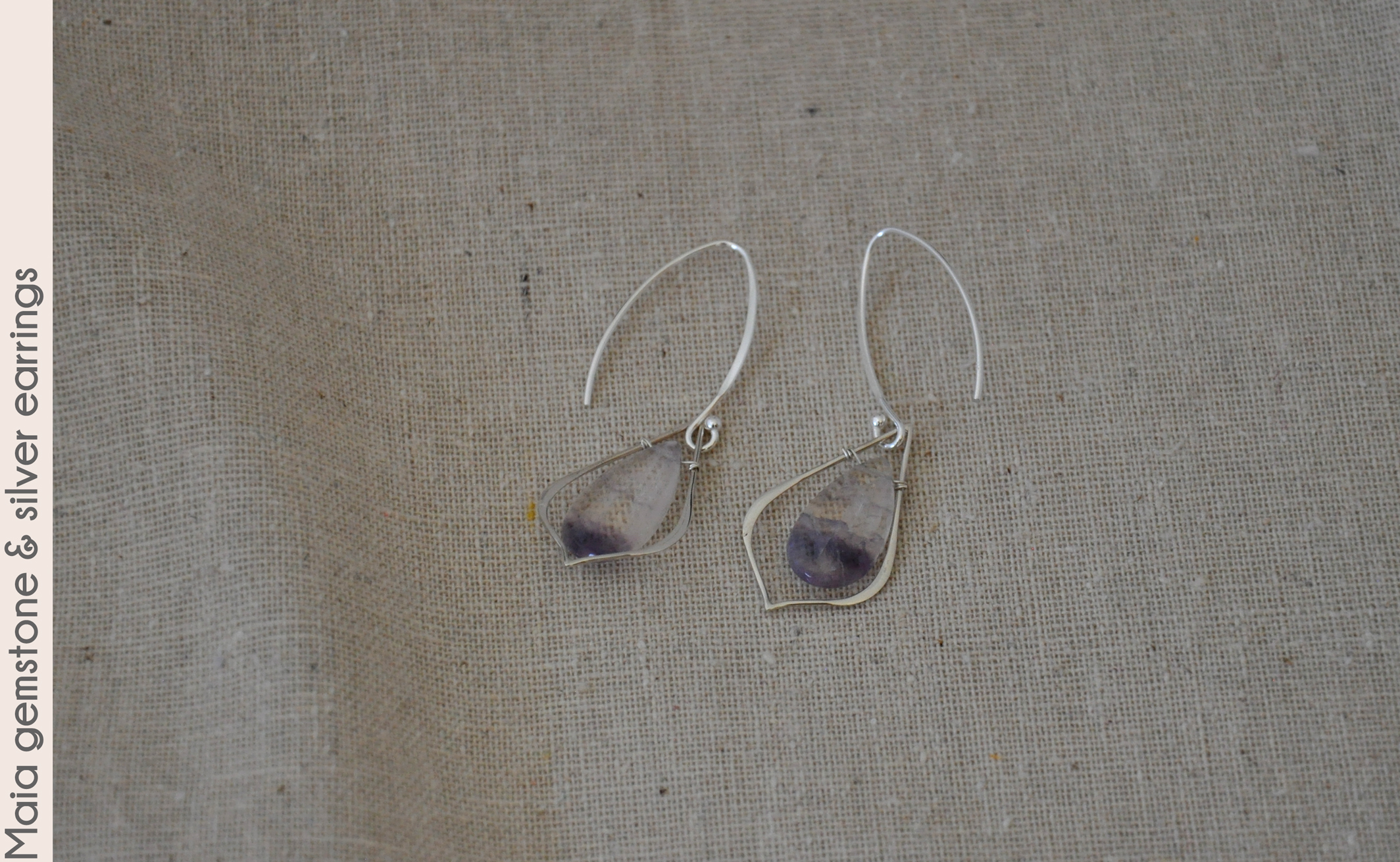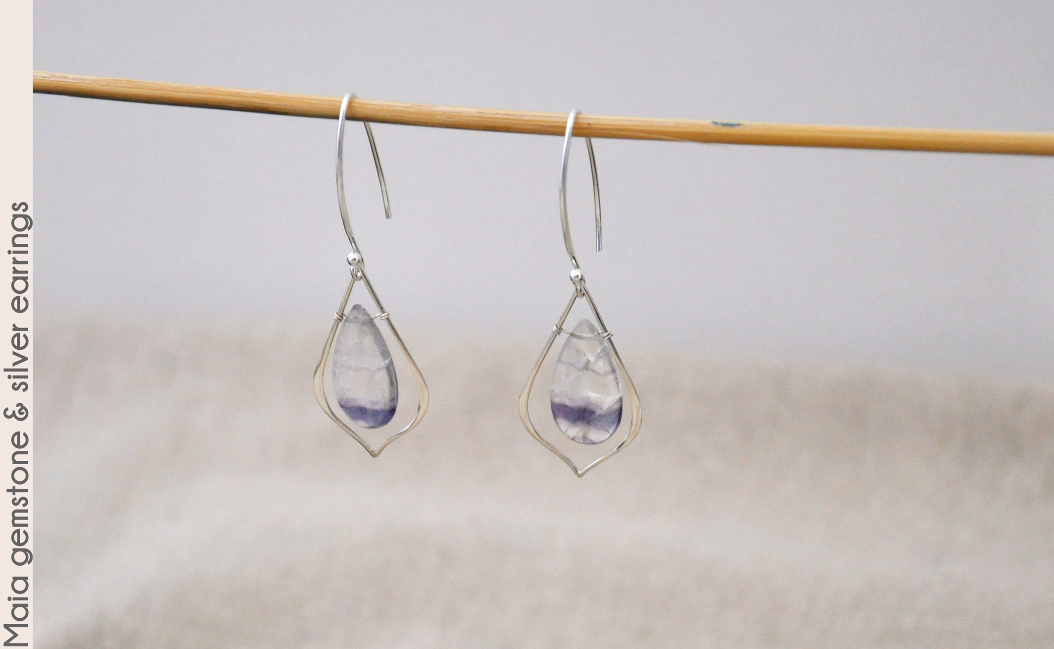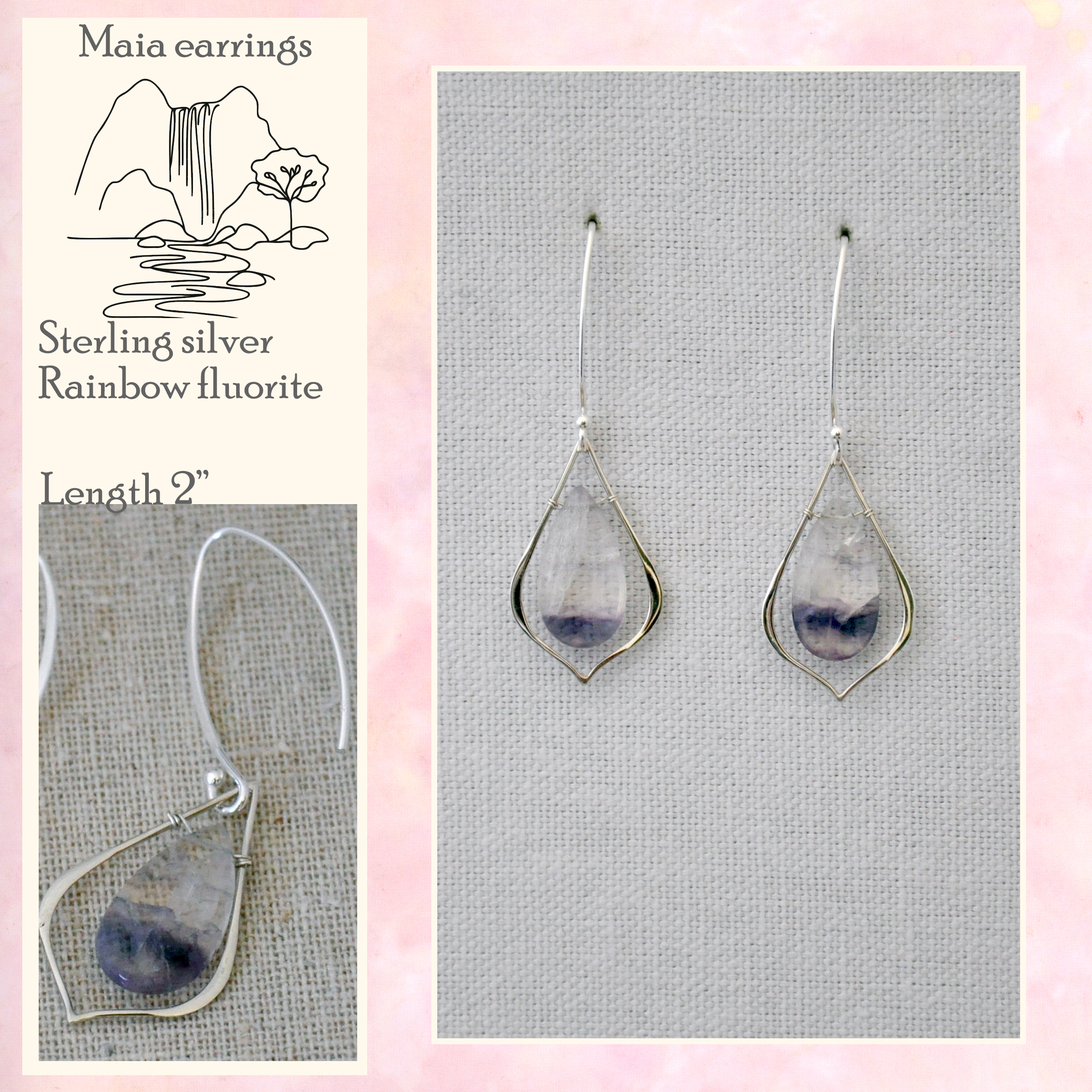 rainbow fluorite gemstones shining within sterling silver frames which hang from graceful long sterling silver