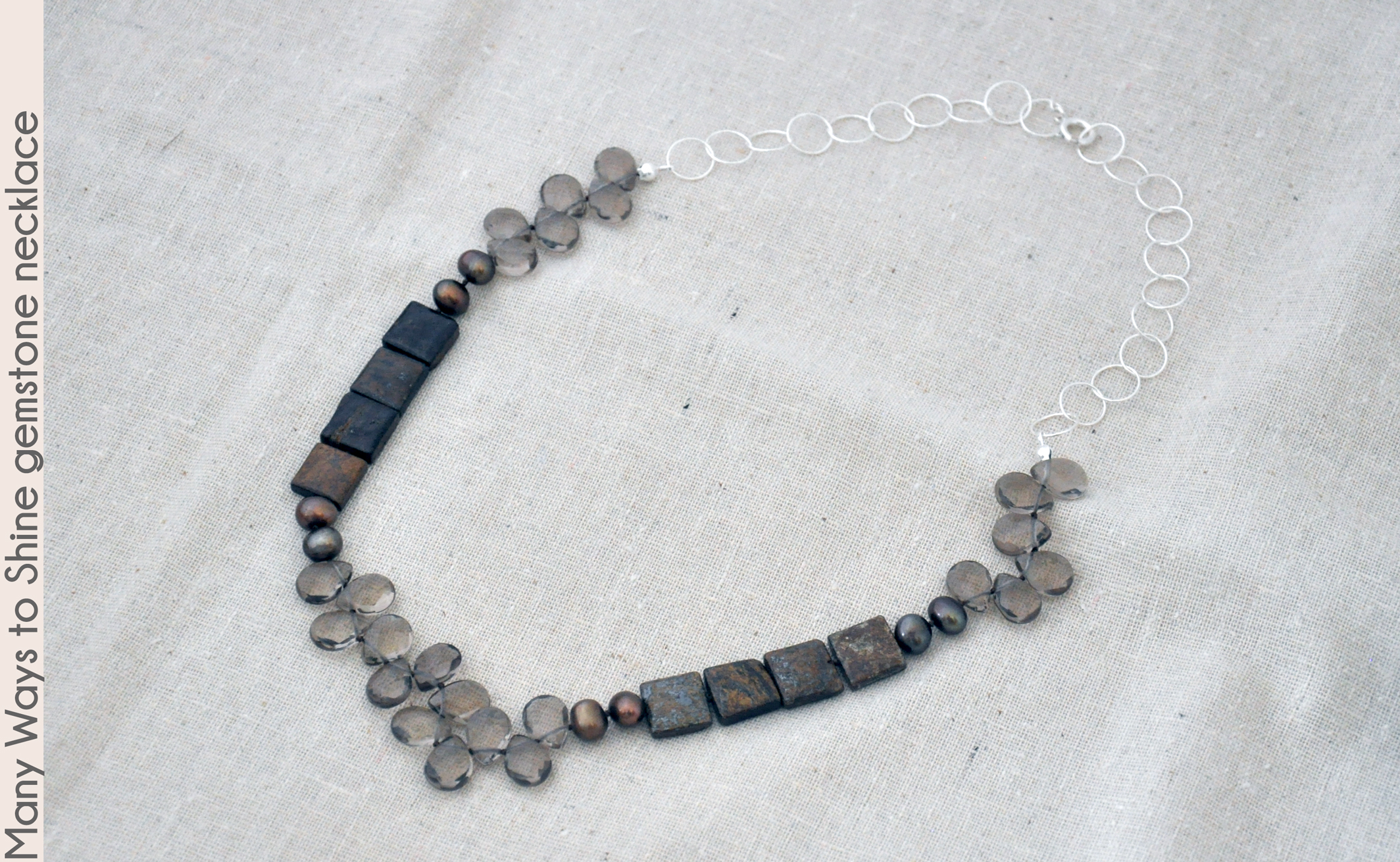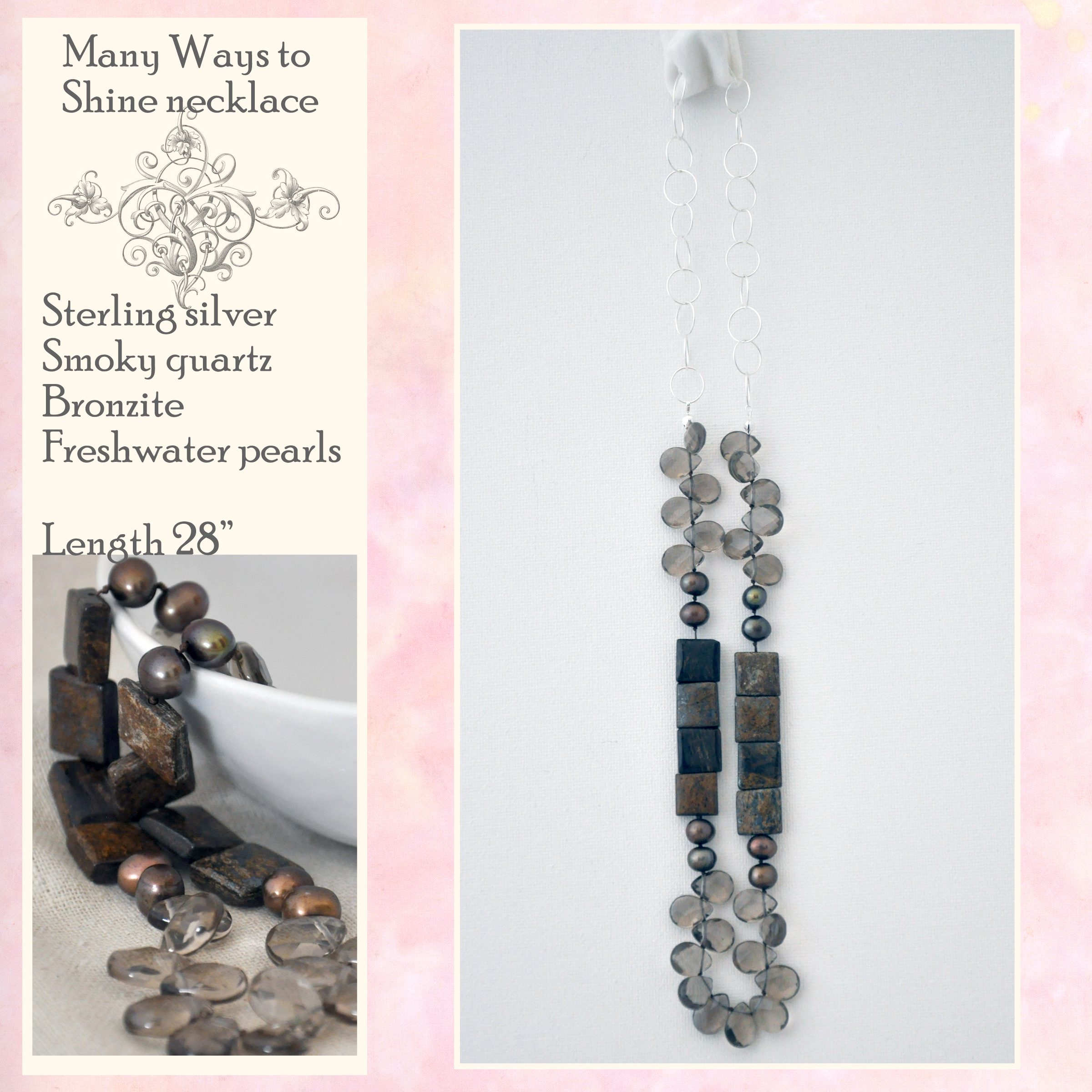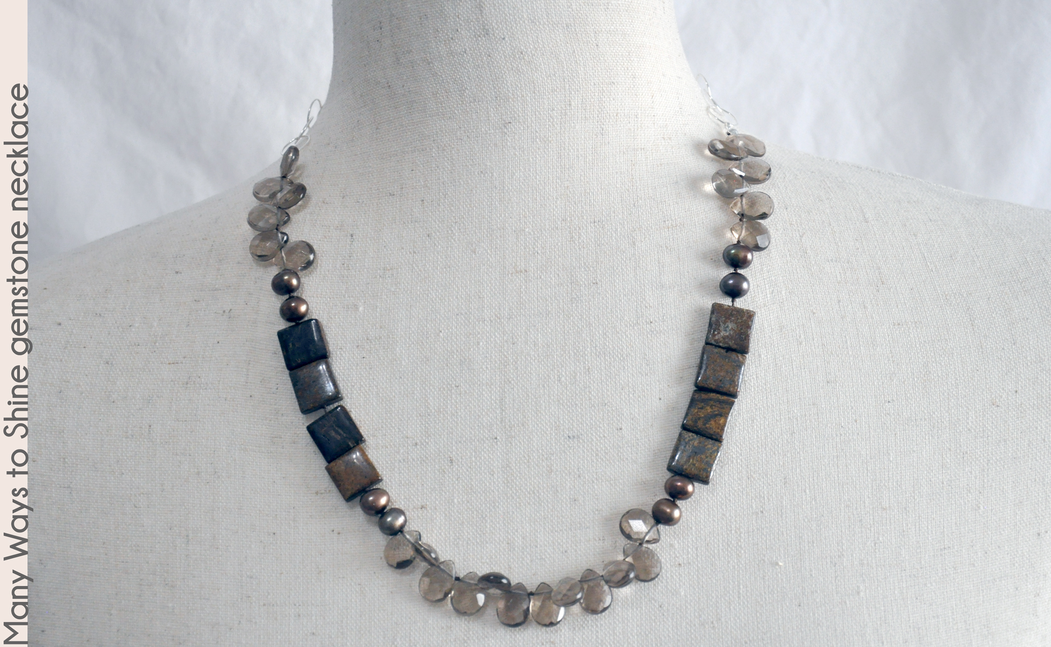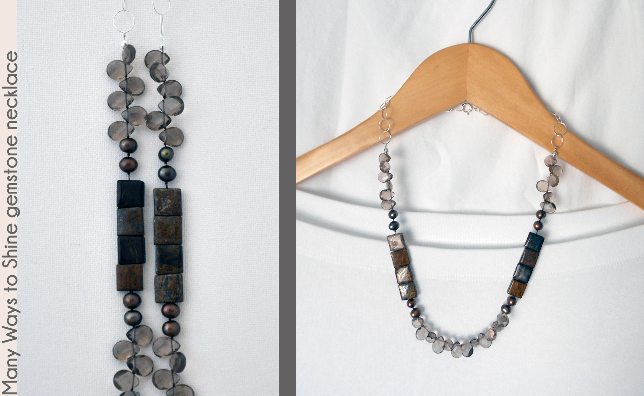This 28" necklace has many ways to shine, from the clear smoky quartz teardrop gemstones to luminous colored freshwater