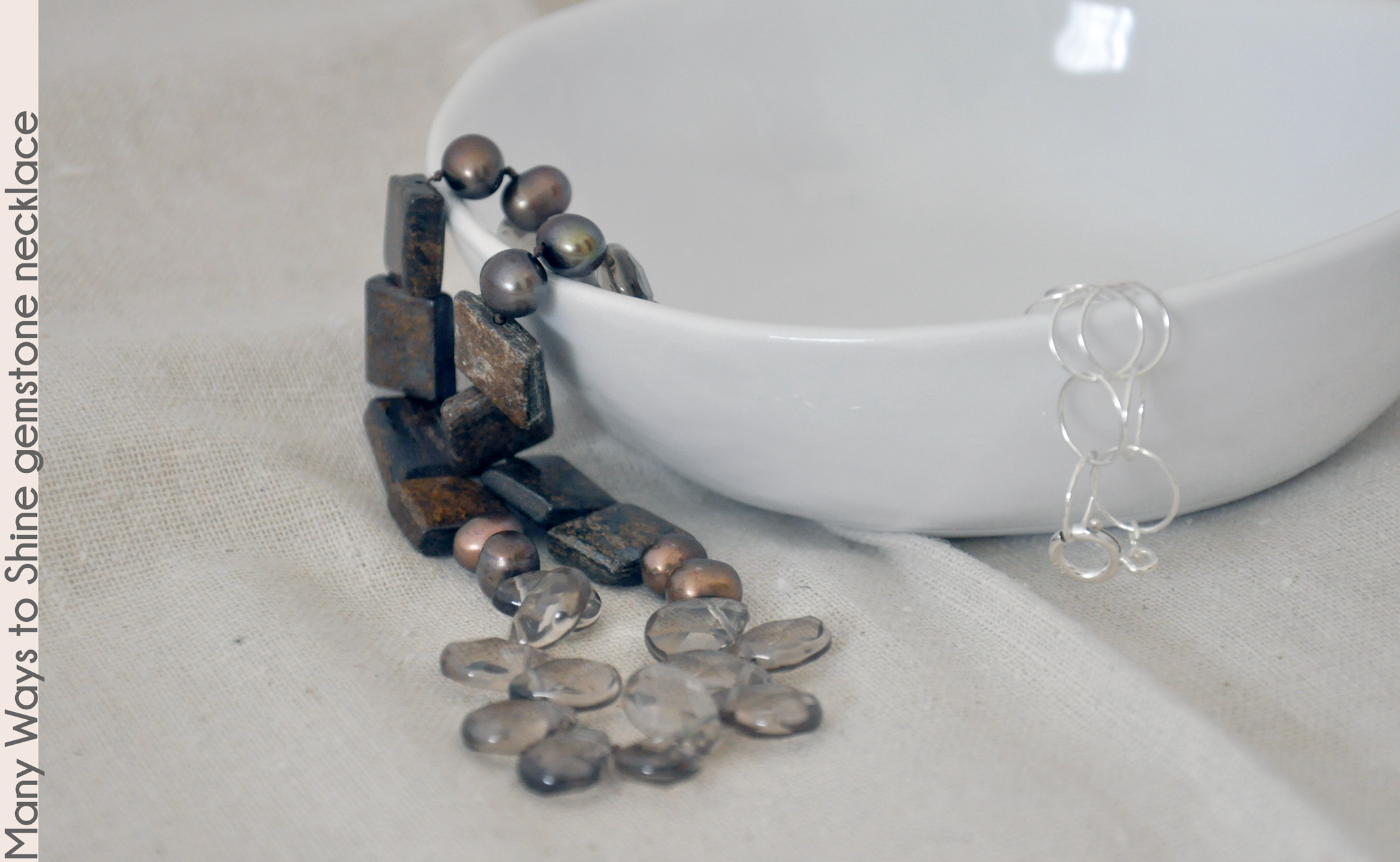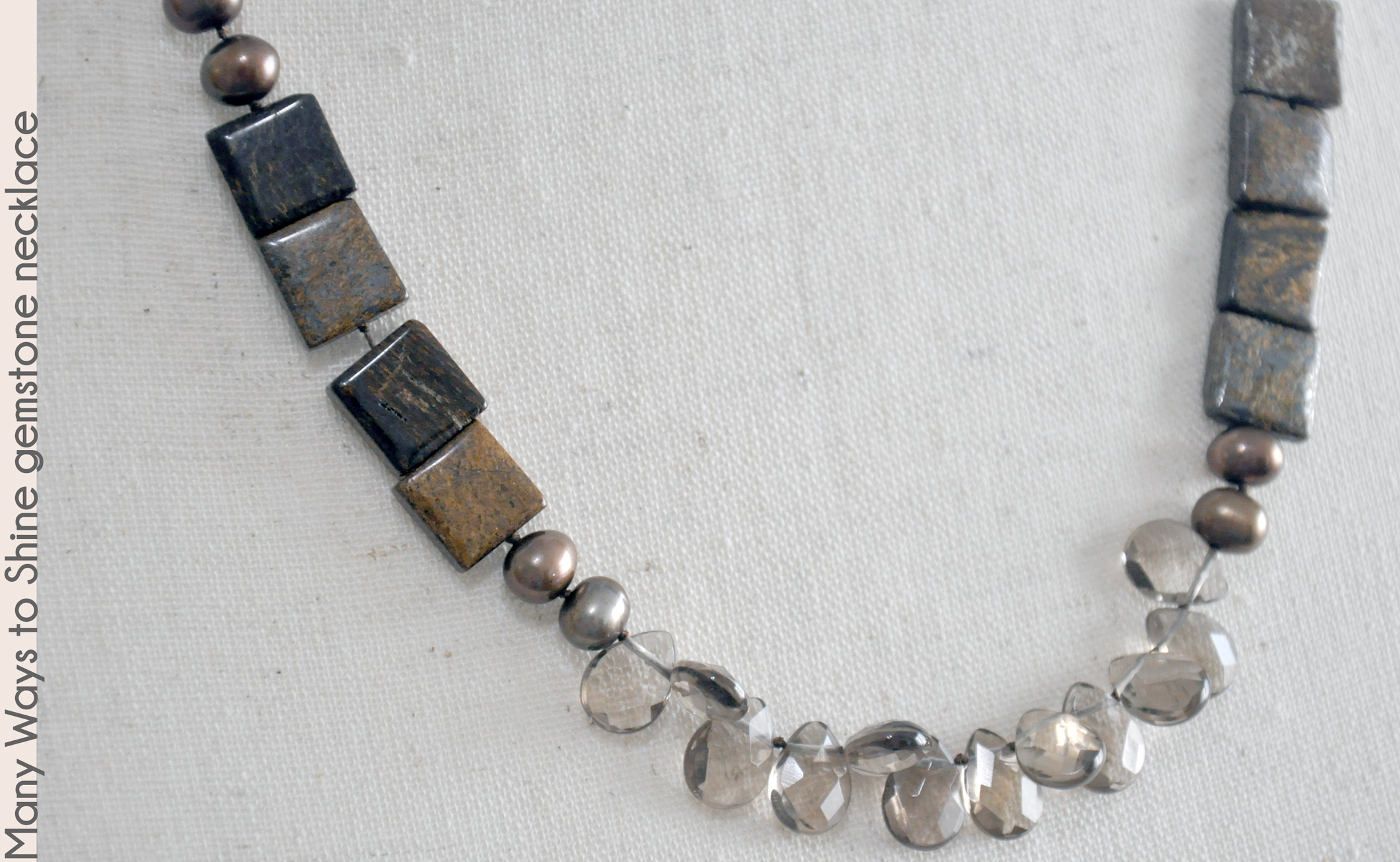 pearls to gleaming bronzite gemstone squares. The gemstones are handknotted on silk cord for superior drape and connected