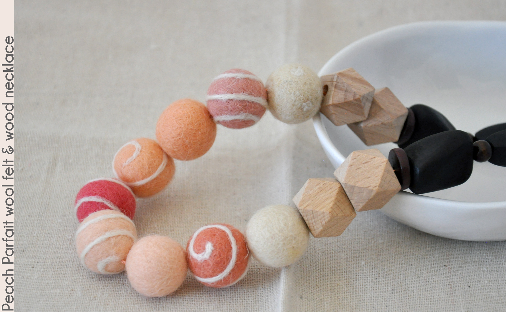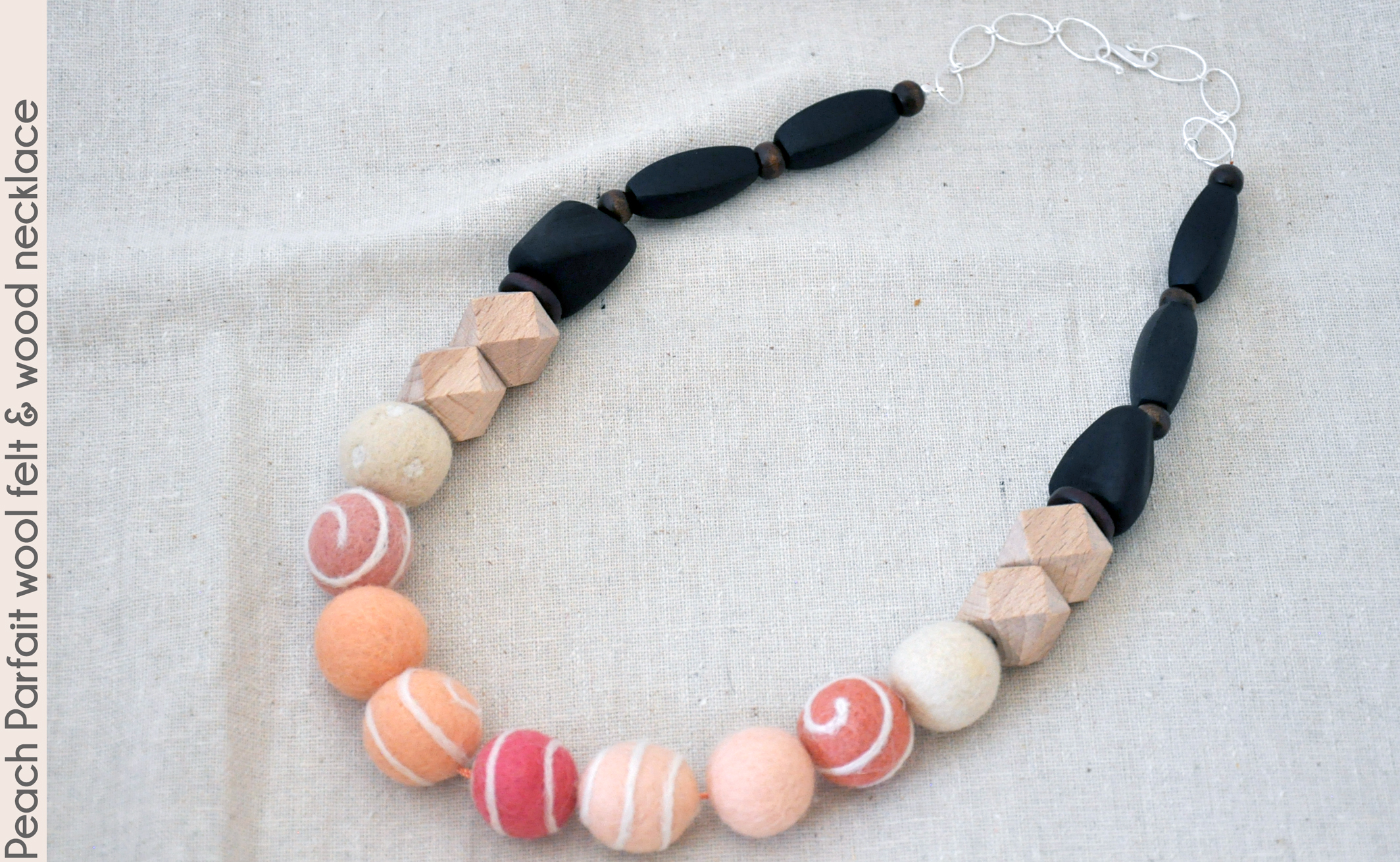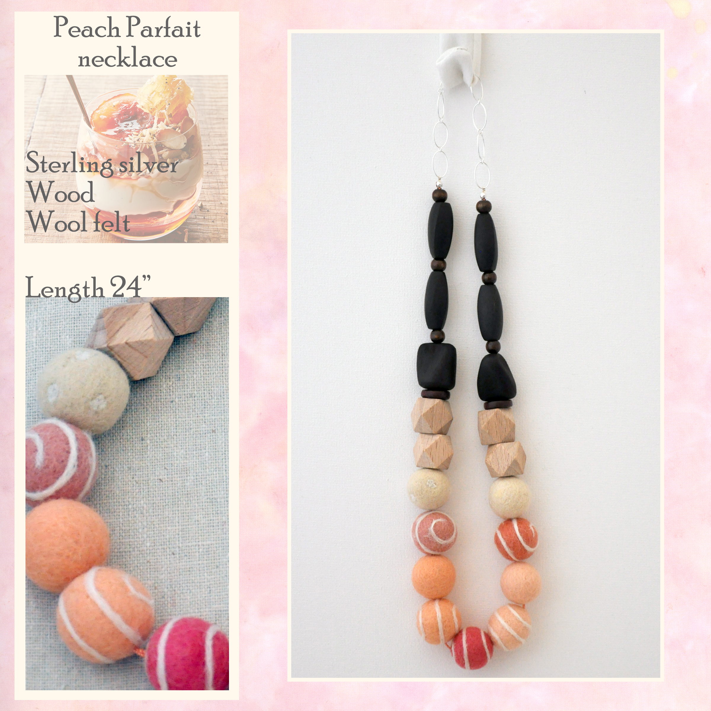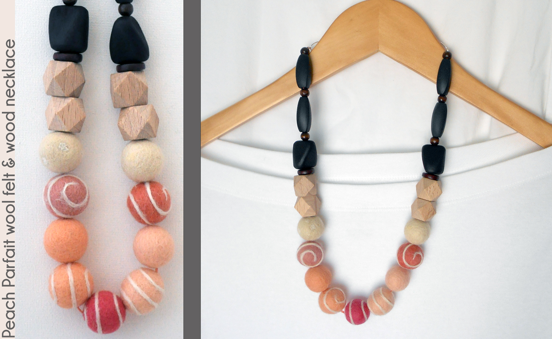 Yummy peach parfait colors are found in this fun 24" wool felt and wood necklace. The wool felt beads