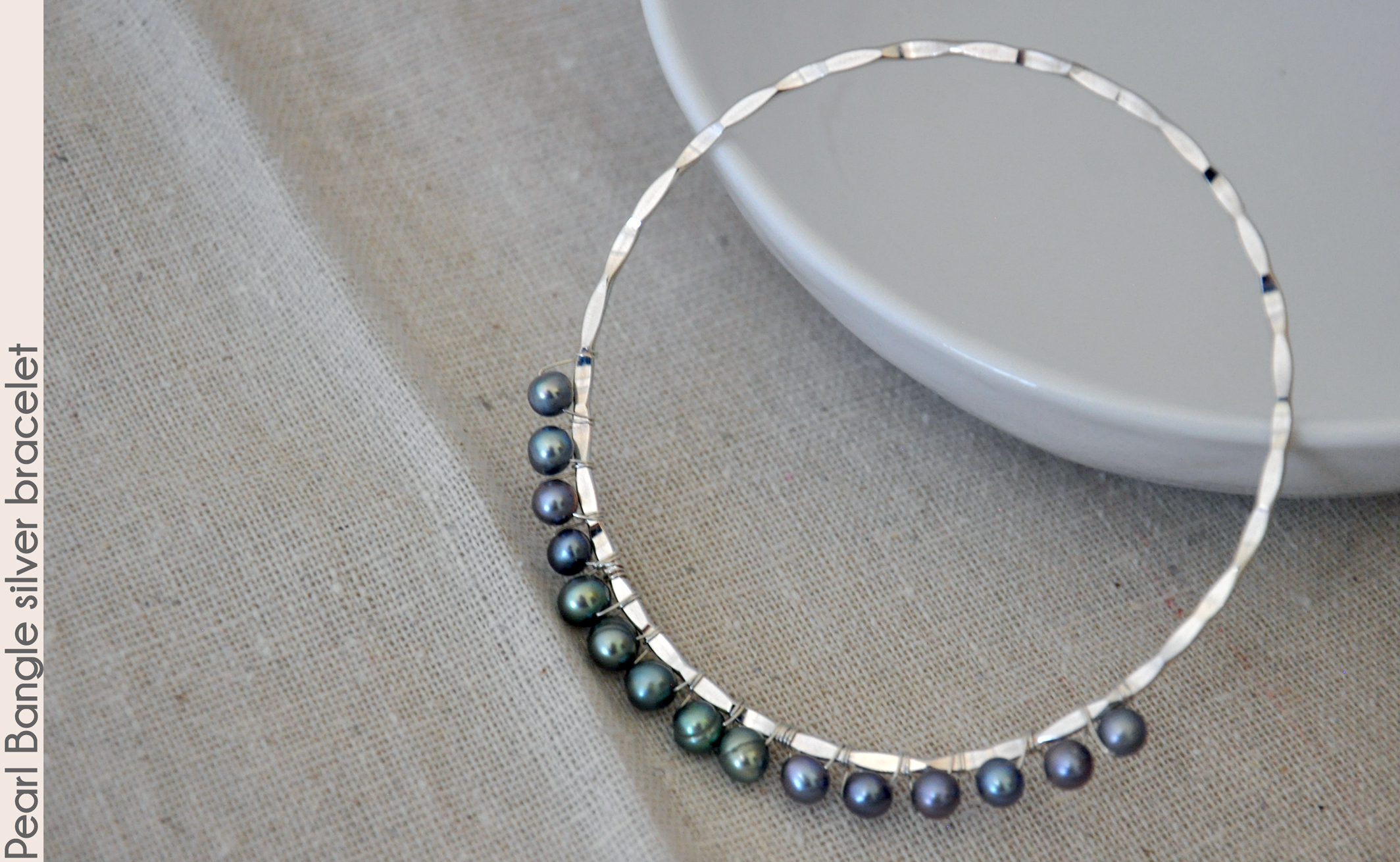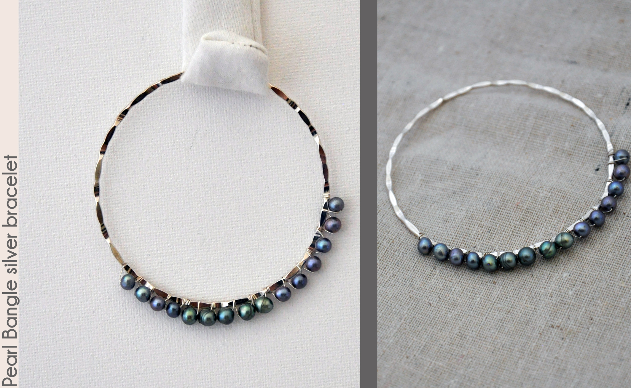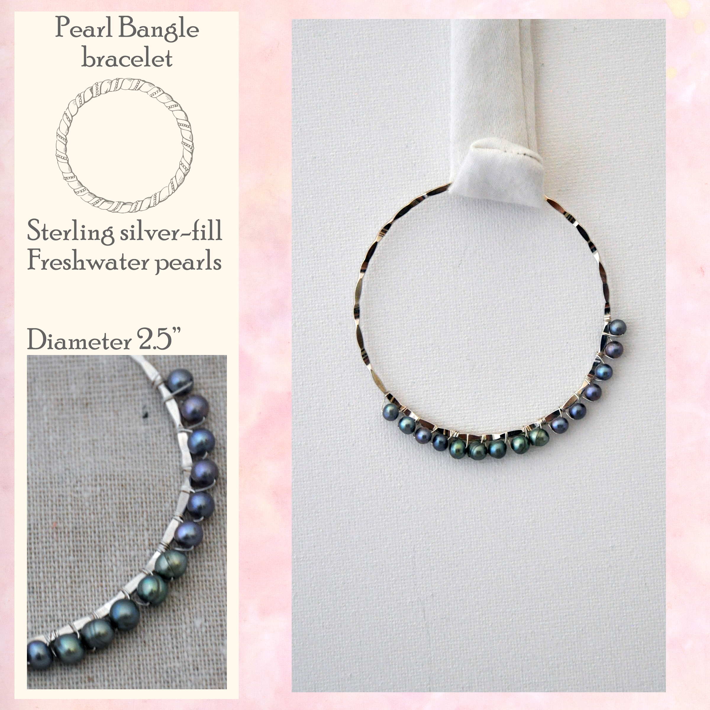 a 7" bracelet). The pearls are wrapped securely with sterling silver fill wire, and the bangle is moderate