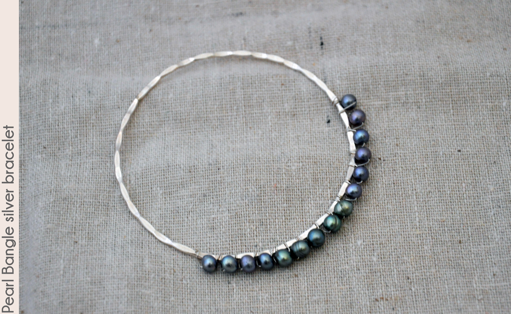 Peacock colored freshwater pearls circle this 2.5" diameter sterling silver fill bangle (roughly equivalent to
