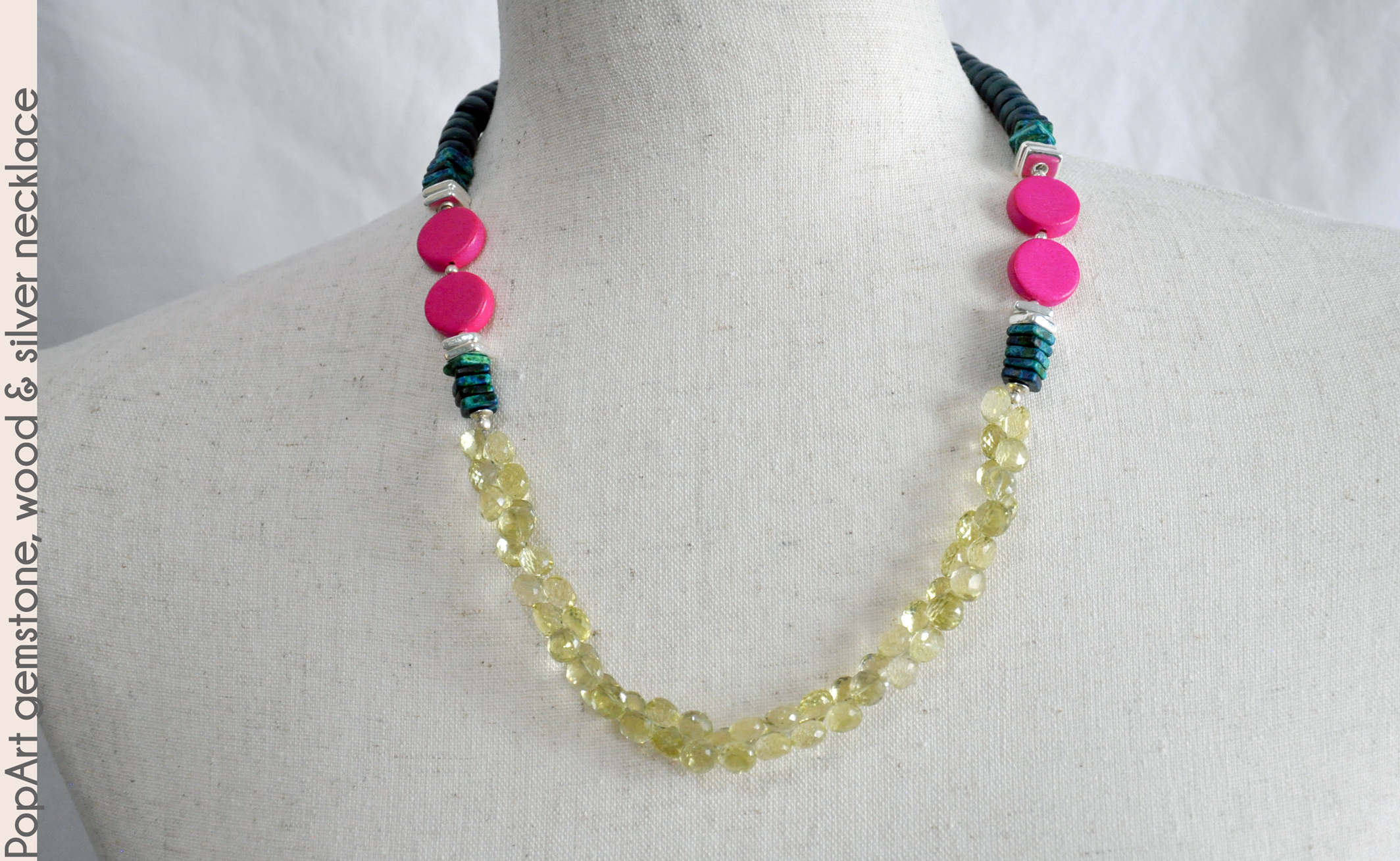 with parody. Crisp lemon quartz faceted teardrops form the center, with teal blue and silver colored ceramic rondelles