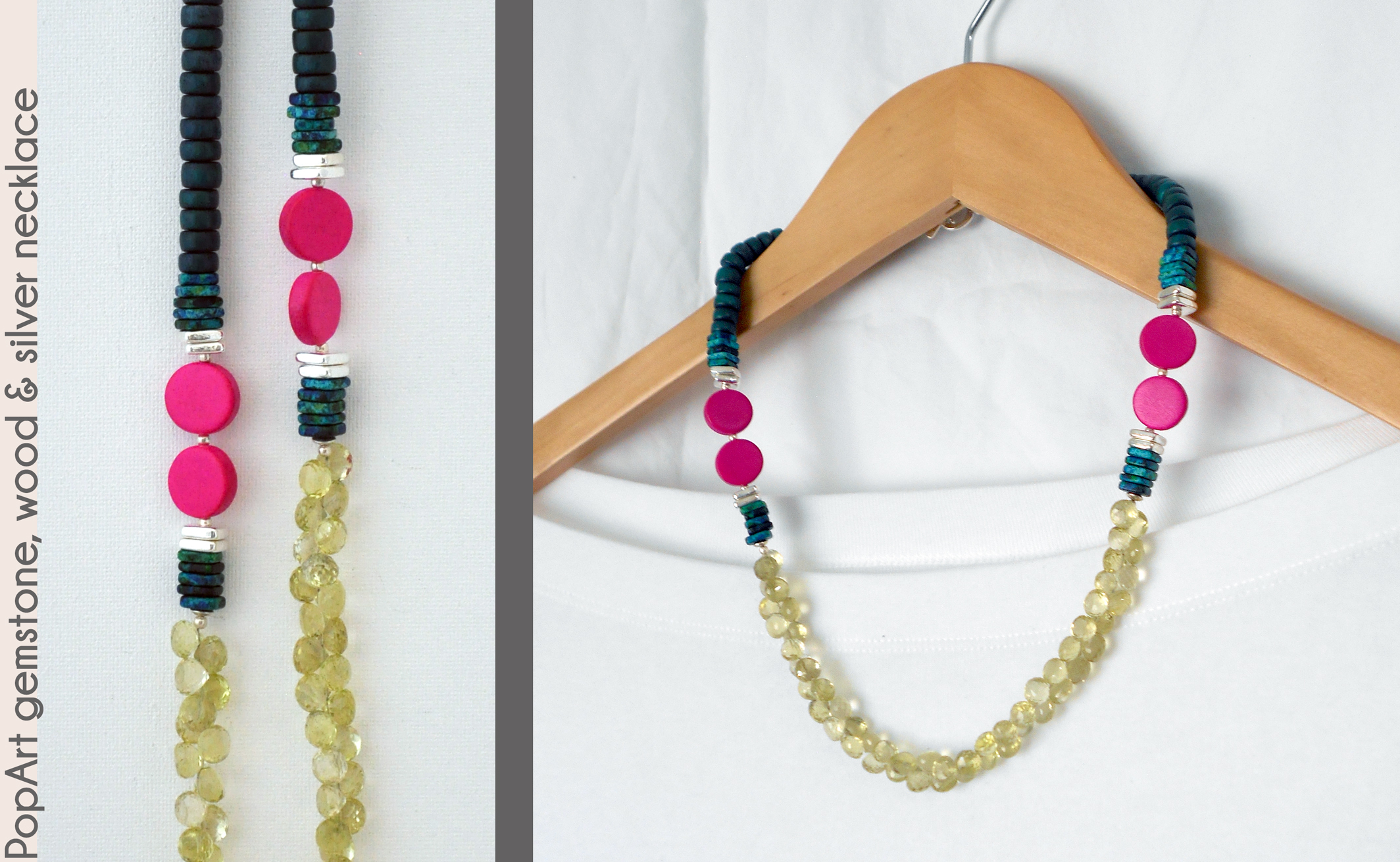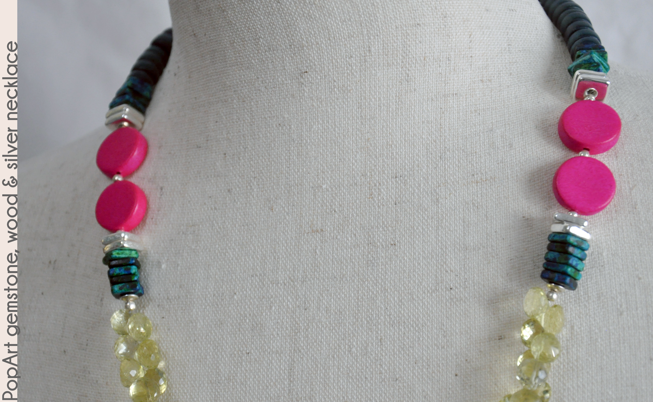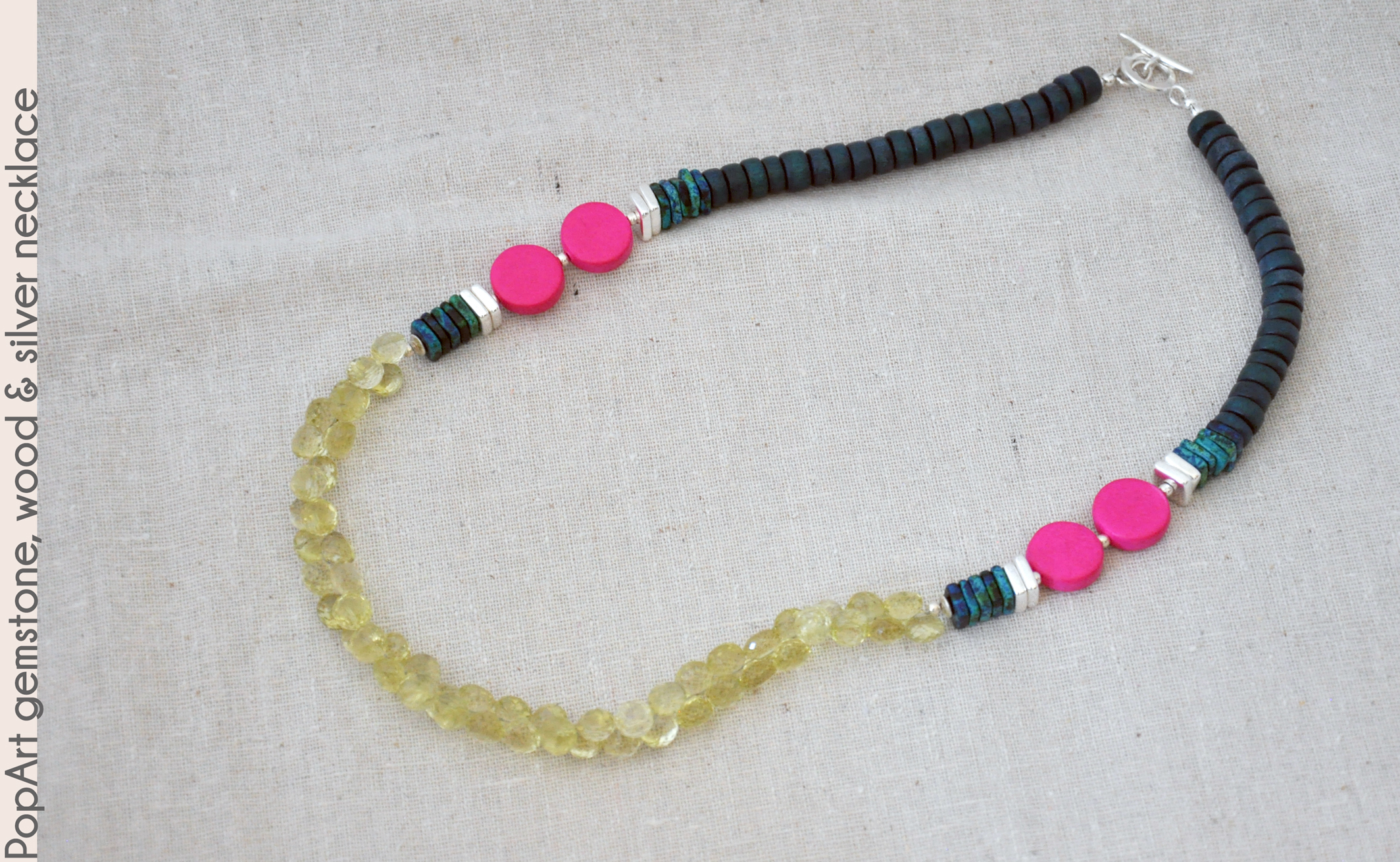 and hot pink wood coins to the sides. Teal blue wood rondelles finish the piece and attach to a Hill Tribe silver toggle