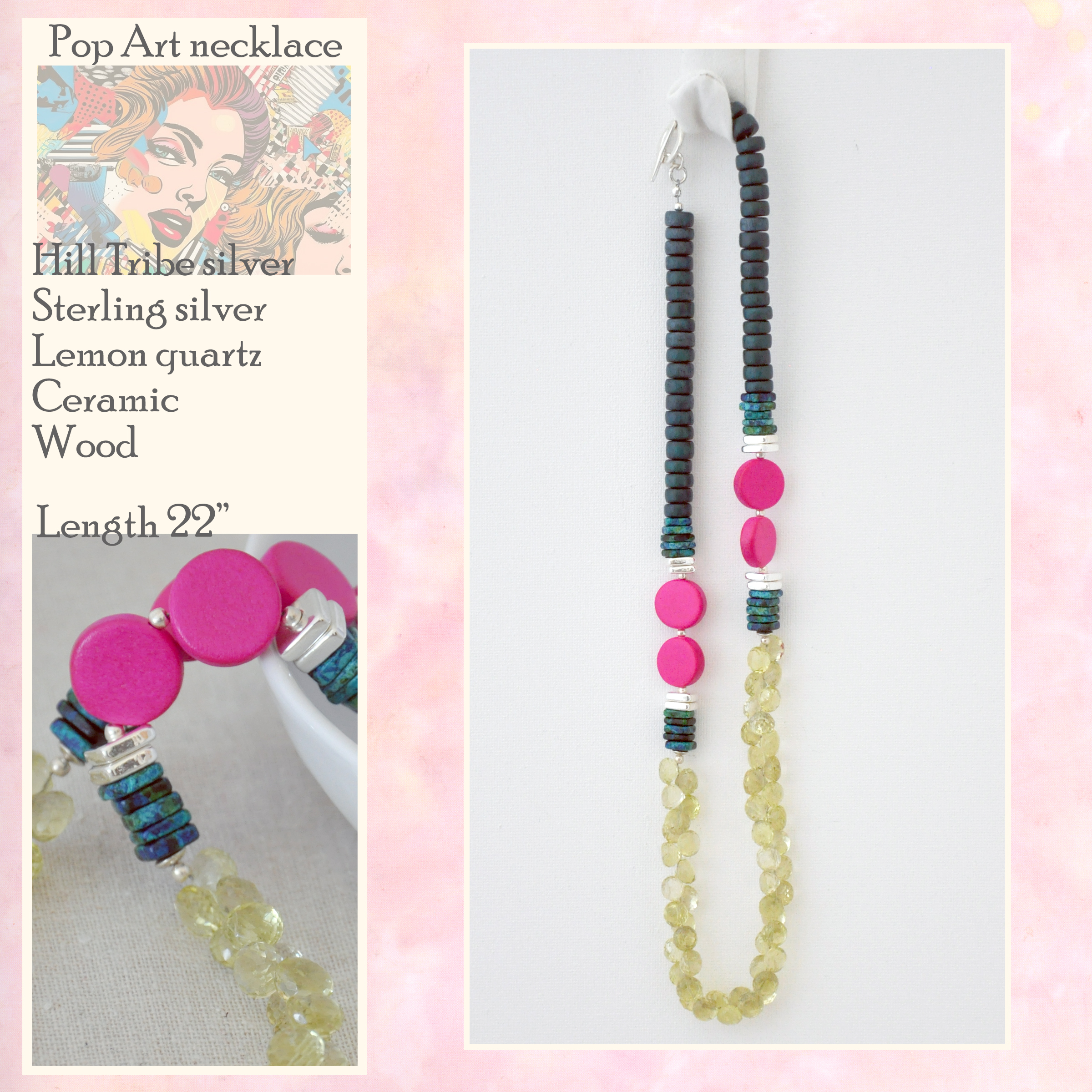 This 22" necklace has bright color and bold contrast of pop art.