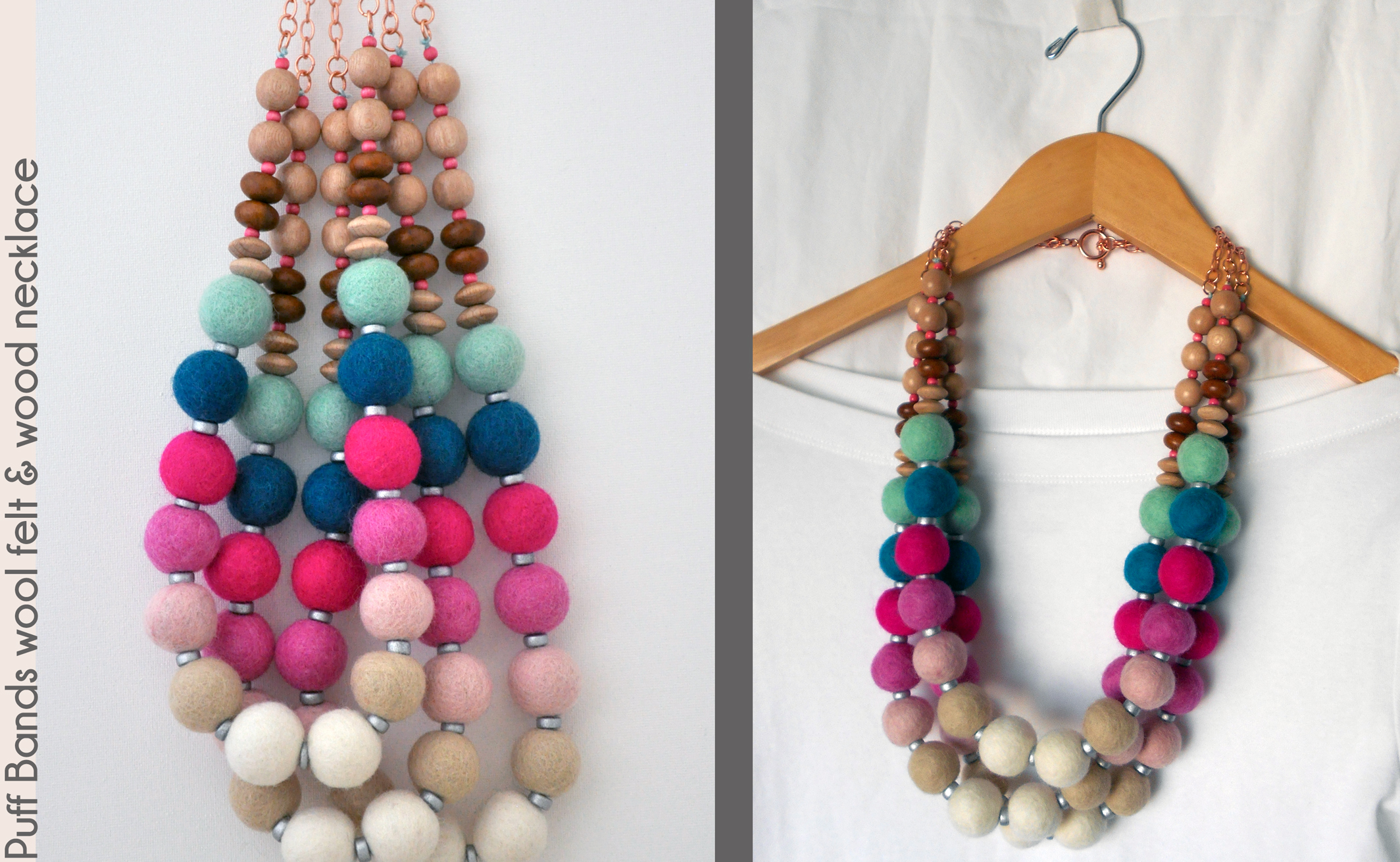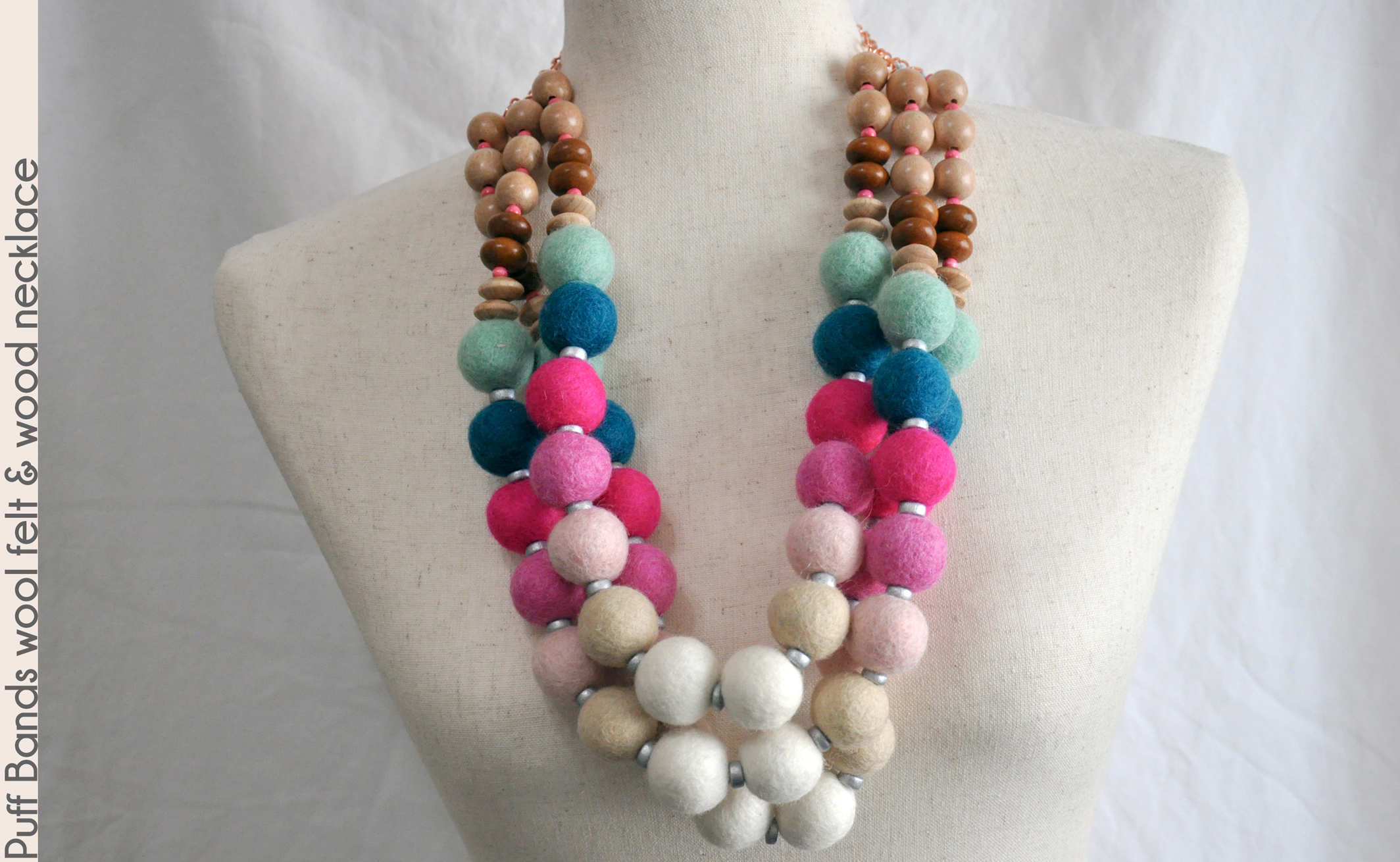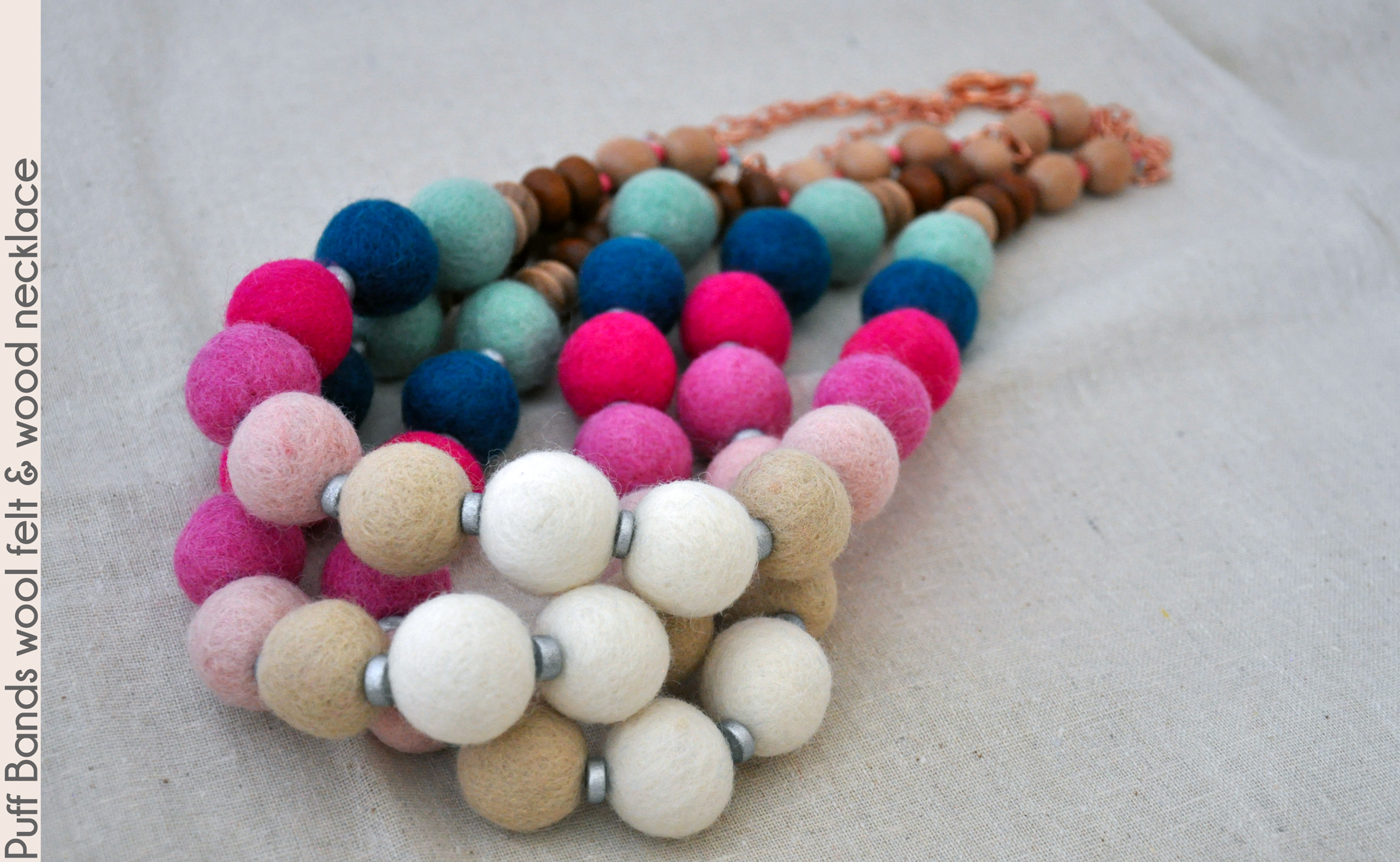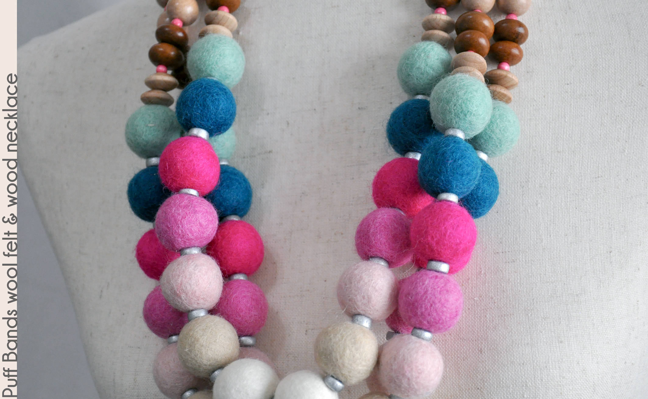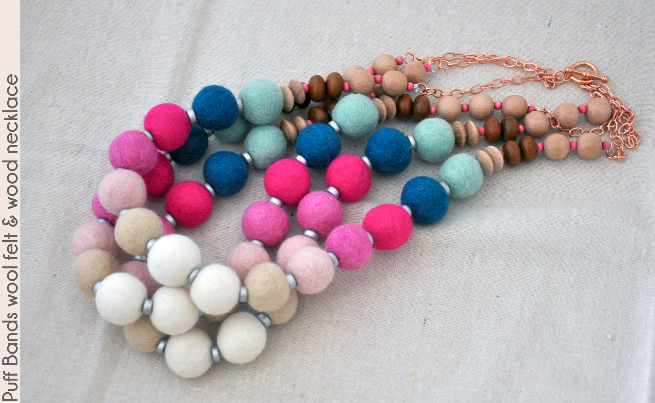 inch wool felt balls in intense, bright colors of teal and fuchsia with natural wood beads