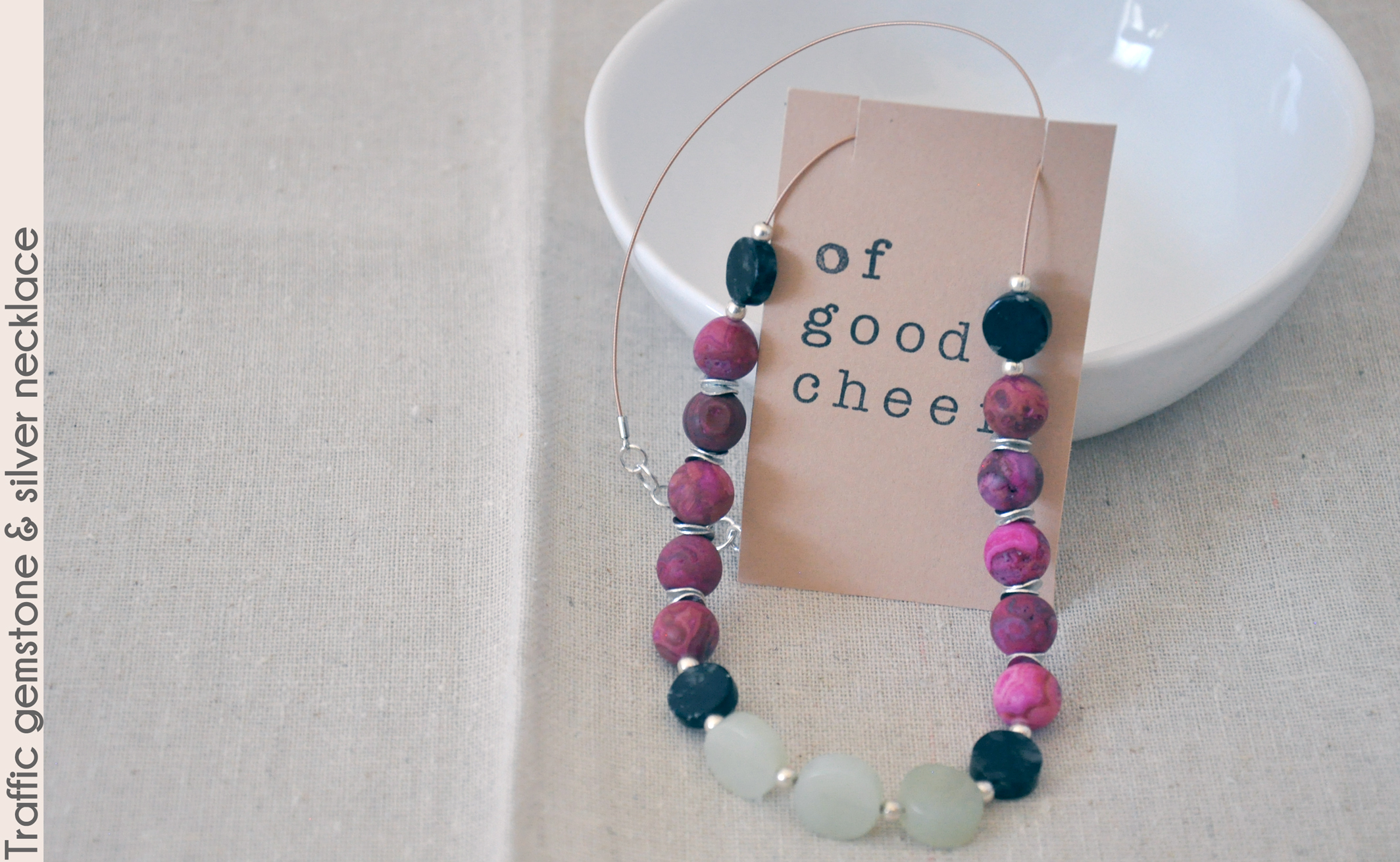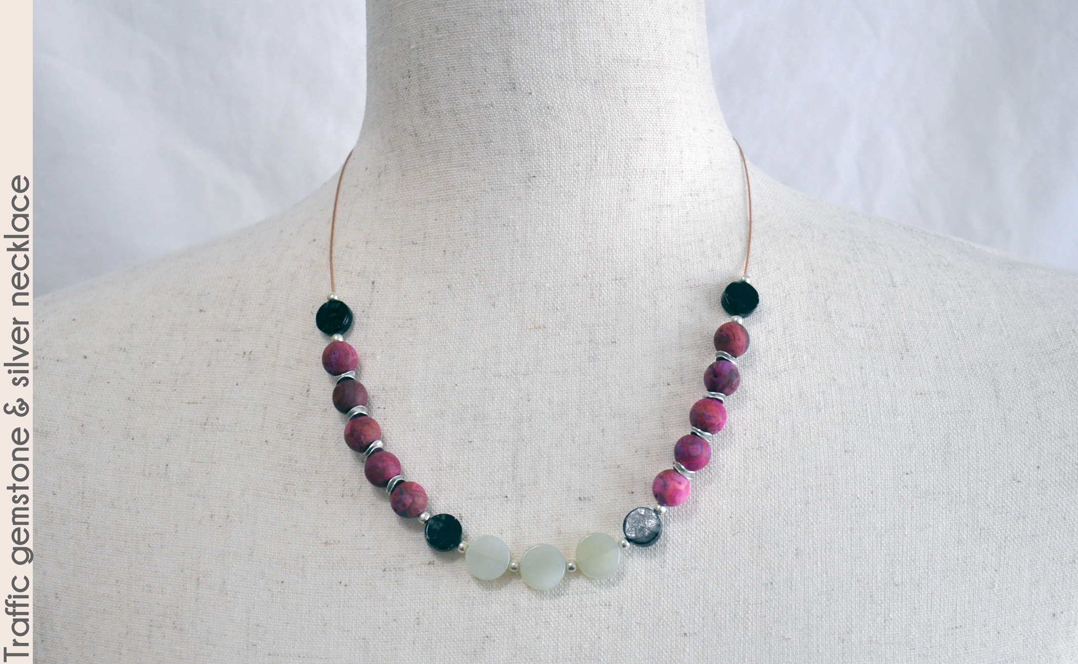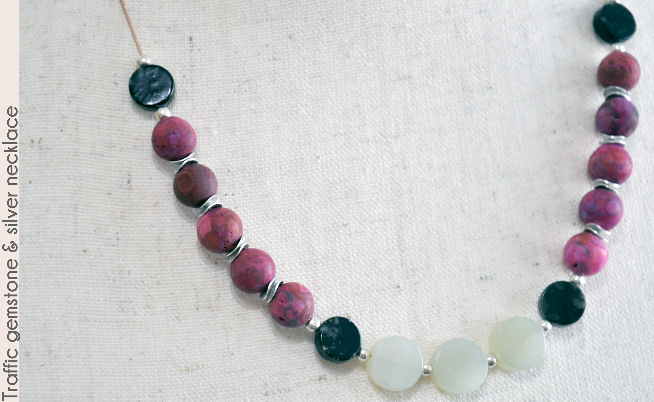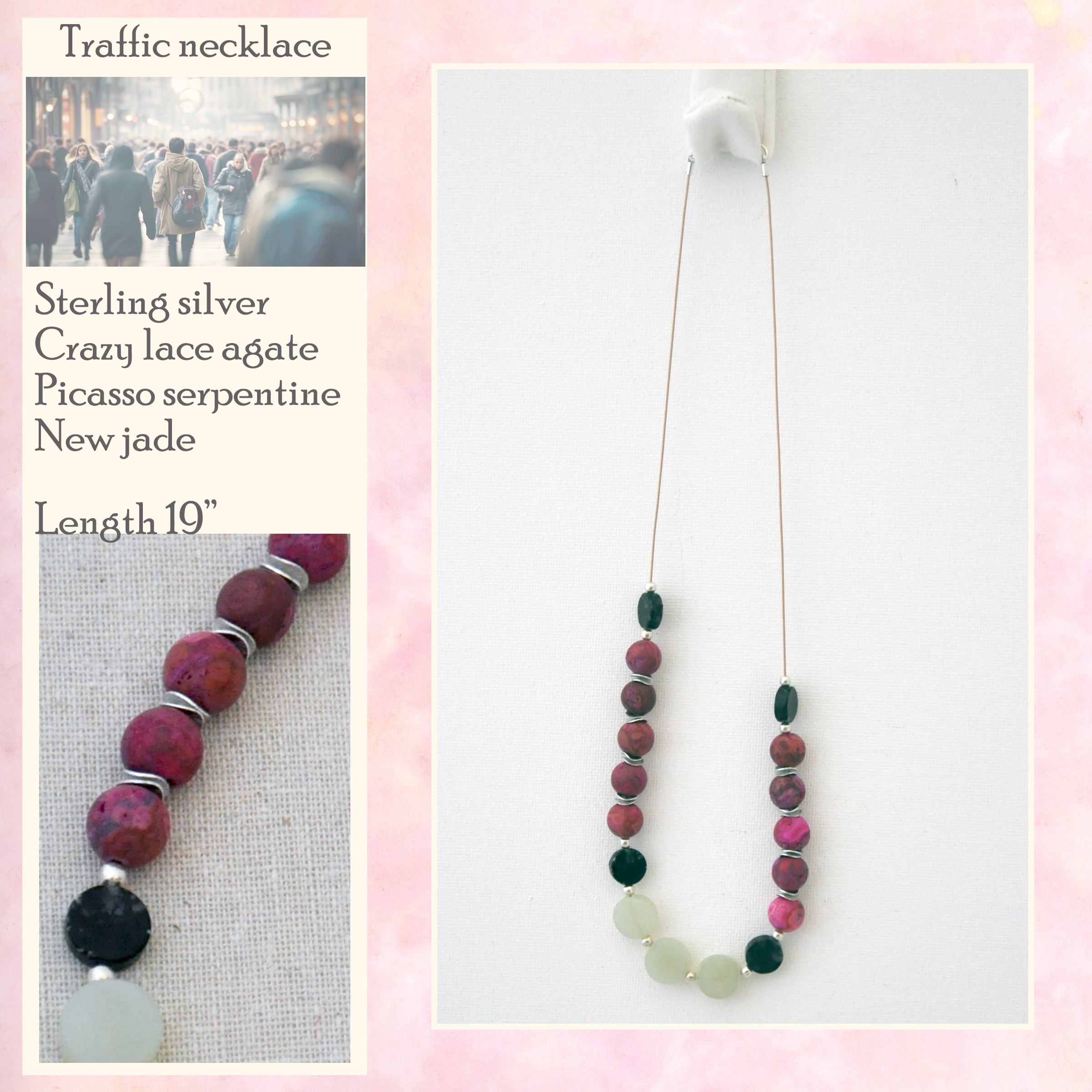 new jade serpentine. Dark picasso serpentine beads separate the dynamic colors, and all beads are spaced